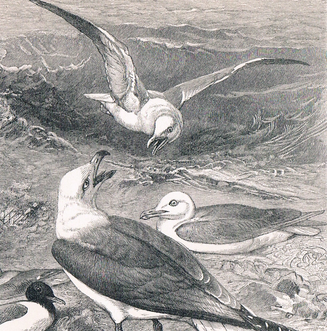 Le père noua ses doigts au col flexible et blanc du goéland. Puis ils s’agrippèrent étroitement autour de la poitrine ; et l’agonie commença. Sous l’étreinte, le corps, vêtu de claire écume, se débattait, se gonflait, se tendait ; la tête sanglante se soulevait pour respirer encore un peu ; et chaque gorgée d’air qui s’en allait était un peu du souffle bleu du ciel. Au creux de ses grosses mains cruelles, lâches, crochues à s’acharner sur l’épargne, il emprisonnait la vie tout entière ; et le rythme de l’univers, résumé au battement du cœur du grand oiseau douloureux, palpitait entre ses doigts, ne voulant pas mourir encore. Du fond de sa conscience et des temps, pervertie et raffinée à toutes les civilisations, l’instinct des grands aïeux farouches, qui luttaient contre les fauves, s’exaltait au geste ridicule et lourd de cet homme, qui tuait et prolongeait la mort, pour l’unique volupté de tuer ; car, à l’exemple des forêts primitives qui composèrent la terre, notre âme est faite de passés innombrables, et nous ne sommes jamais que des cimetières vivants.