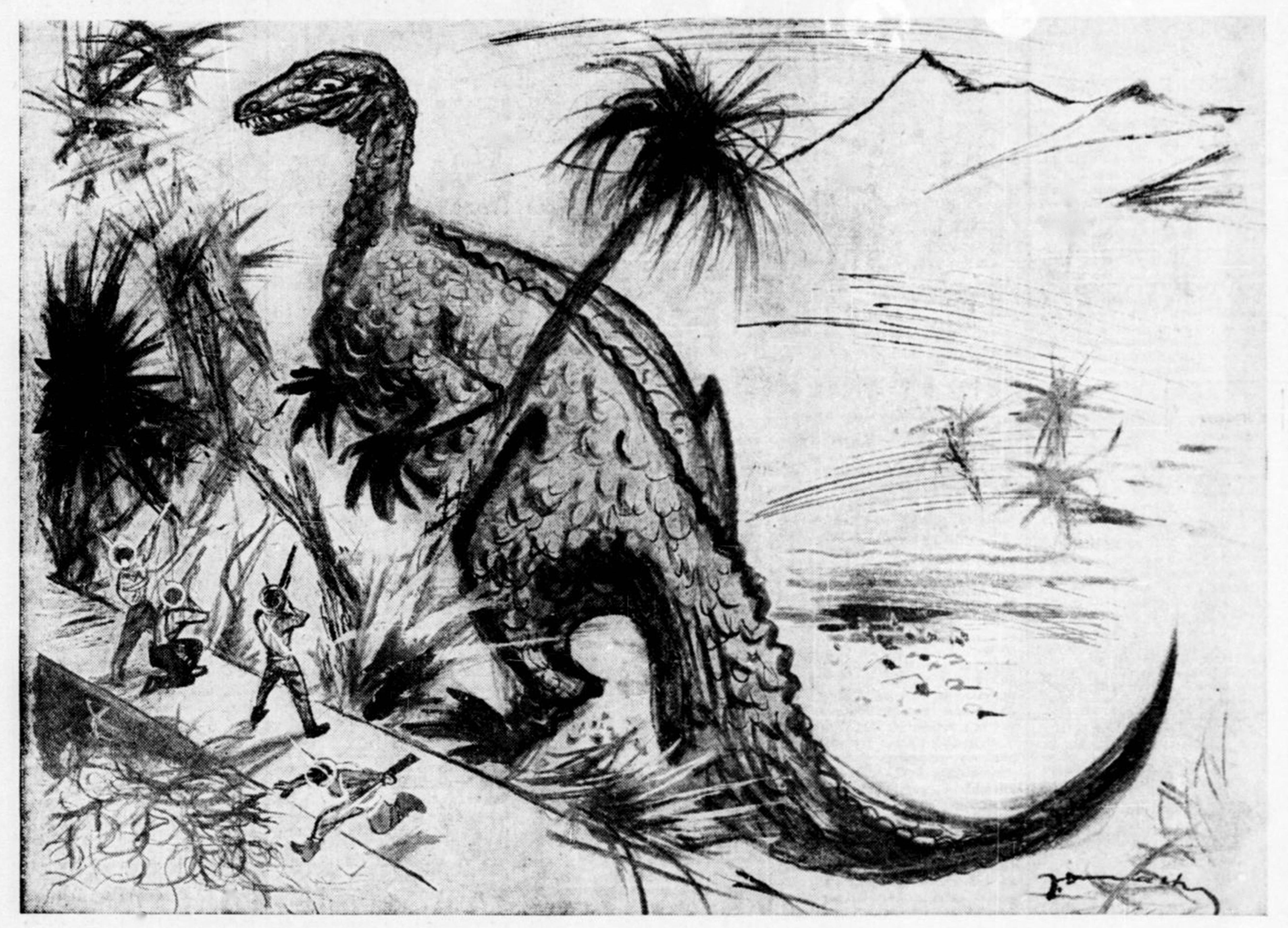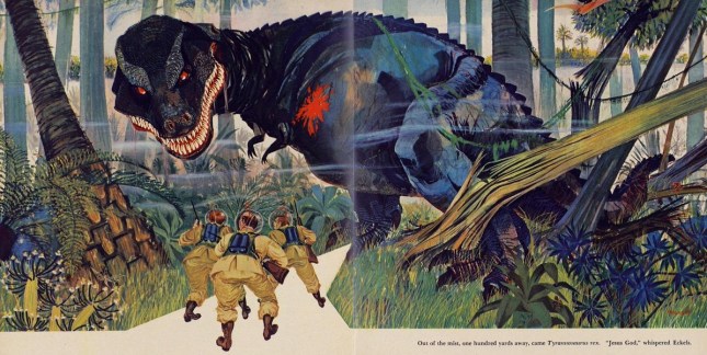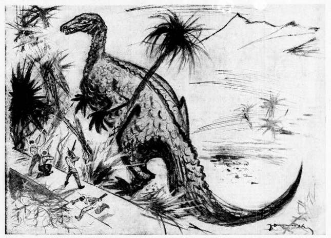 À son premier mouvement, le monstre se précipita en avant avec un cri terrible. Il parcourut cent mètres en quelques secondes. Les fusils pointèrent vers lui et crachèrent le feu. Un ouragan issu de la gueule du monstre les entoura d’une puanteur de pourriture et de sang corrompu. Le dinosaure rugit ; ses dents étincelaient au soleil.