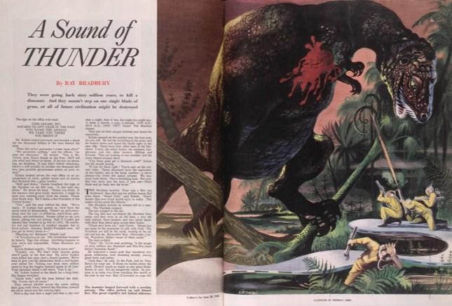 (« Une Science Fiction de Rey [sic] Bradbury, » traduite de l’américain par A. de la Falaise, « Les Lettres, » in Carrefour, neuvième année, n° 427, mercredi 19 novembre 1952. L’illustration est extraite de cette publication. Il s’agit de la première adaptation française de la nouvelle « A Sound of Thunder » parue dans Collier’s Magazine, le 28 juin 1952, qui sera reprise dans le recueil The Golden Apples of the Sun, Doubleday, en 1953. La nouvelle sera traduite par Richard Négrou sous le titre « Un Coup de tonnerre, » dans Les Pommes d’or du soleil, collection « Présence du futur », n° 14, Denoël, 1956. Pour des raisons de calibrage, la version d’Alain de la Falaise est malheureusement une adaptation écourtée et édulcorée, le dénouement occultant complètement l’aspect uchronique résultant de « l’effet papillon »)