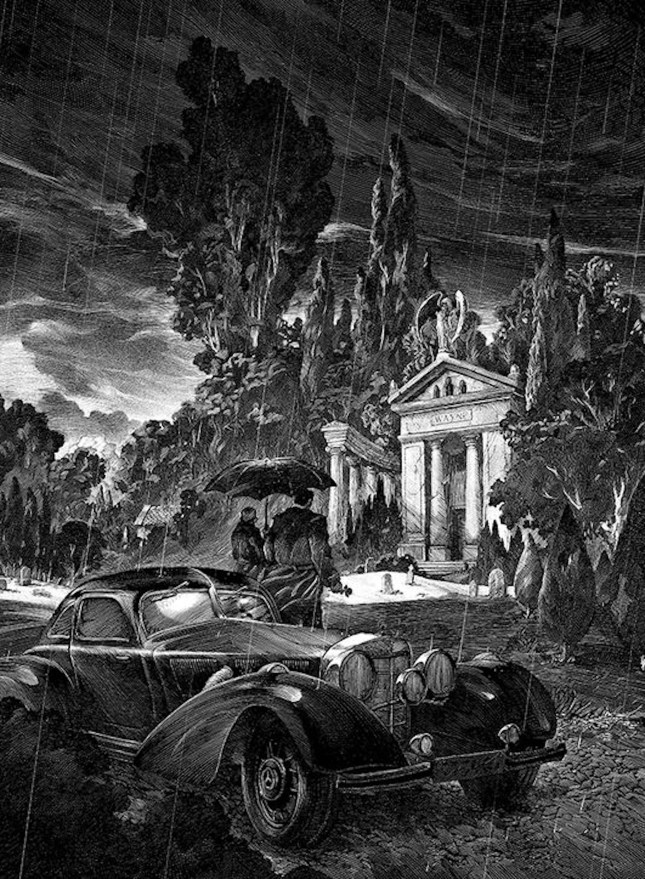 Il fut rapidement dans la poussière de l’auto noire, et fit aboyer son klaxon. C’est alors qu’il observa combien cette limousine était noire. Noire sans un filet de couleur. Funèbre, en vérité.