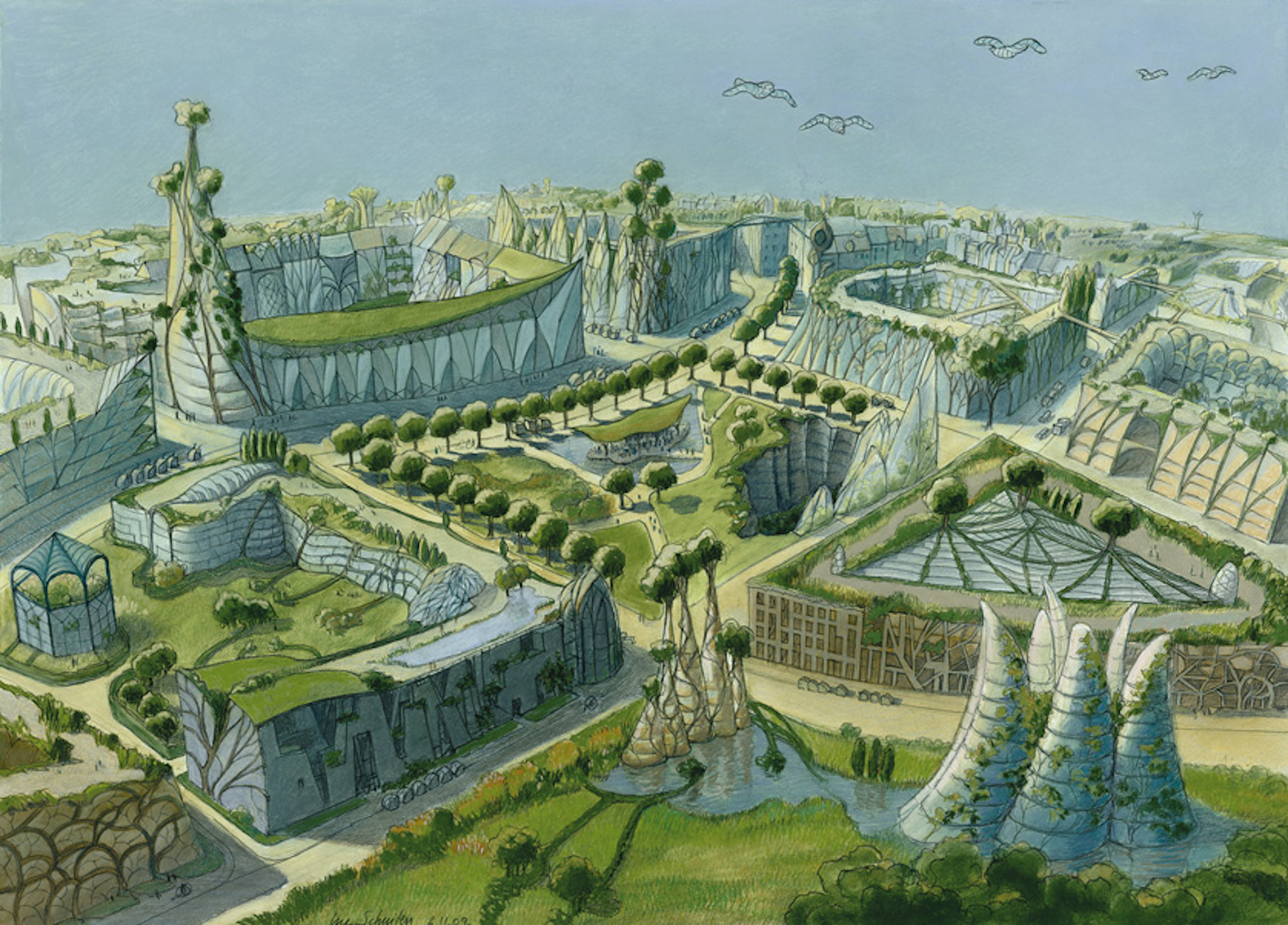 (Charles Malato, in L’Action quotidienne, anticléricale, républicaine, socialiste, cinquième année, n° 1378, 12 Nivôse, An 115 / samedi 5 janvier 1907 ; Luc Schuiten, « Place de la Cité, Bruxelles, » illustration d’affiche pour l’exposition « La Cité végétale, » 2017)
