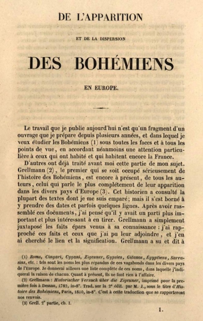 Il existe, disons-nous, un peuple dont l’origine est inconnue, qui a un caractère très tranché, très primesautier, où les femmes sont très belles et sorcières, les hommes braves et voleurs. C’est un peuple primitif et qui a traversé le masque très accusé de sa primitivité. Il est répandu partout et ne se mêle nulle part avec les peuples qu’il hante. Ce sont les zingari, les zingyni, les gypsies, les tziganes, les bohémiens. Voilà la race de Caïn.