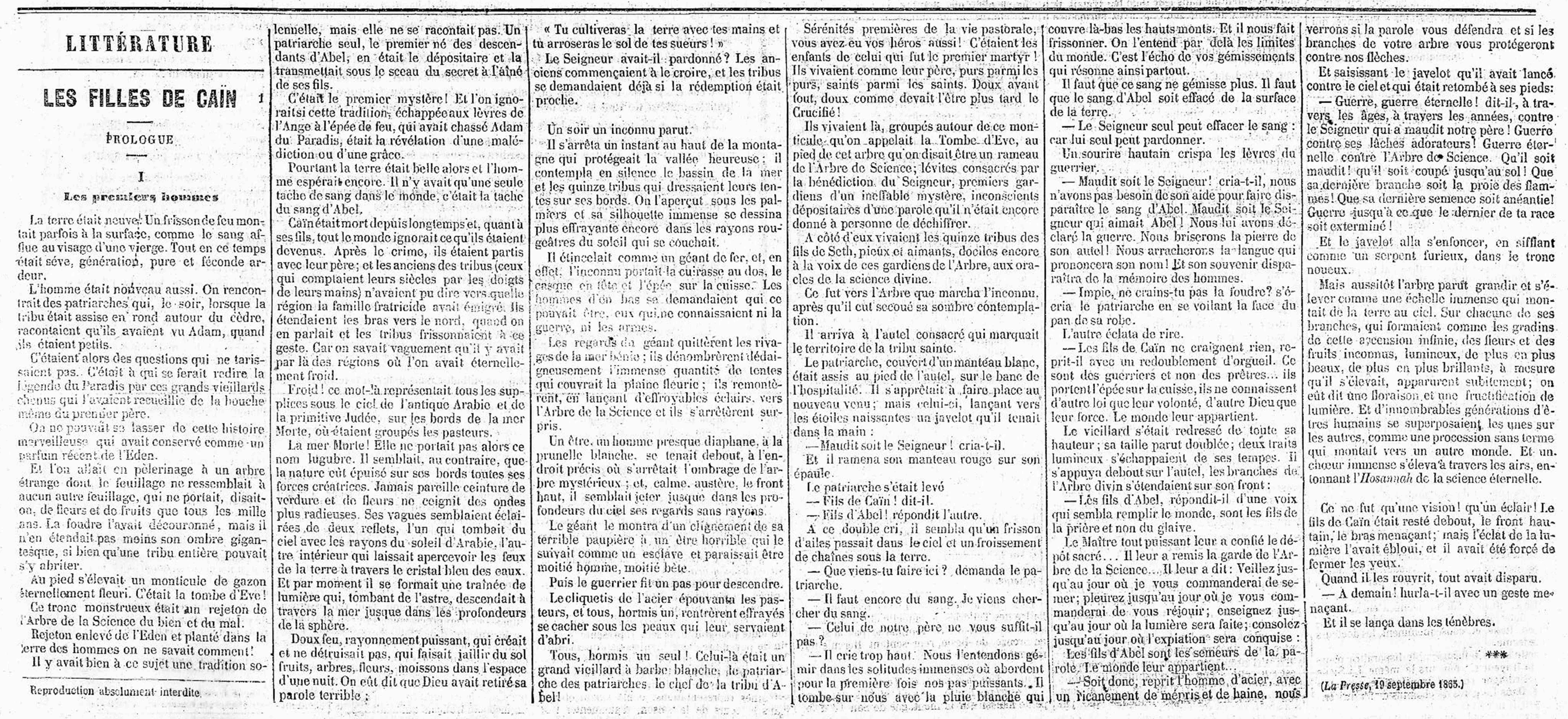 Le titre : Les Filles de Caïn, me plut. L’idée me parut grandiose et on reconnaîtra là la pente d’esprit d’Eugène Sue : il s’agissait d’indiquer dans quelques grands épisodes de l’histoire du monde la lutte des filles de Caïn contre les fils d’Abel, la lutte des incarnations du vice, du mal moral, politique et social, contre les représentants de la vertu et du bien.