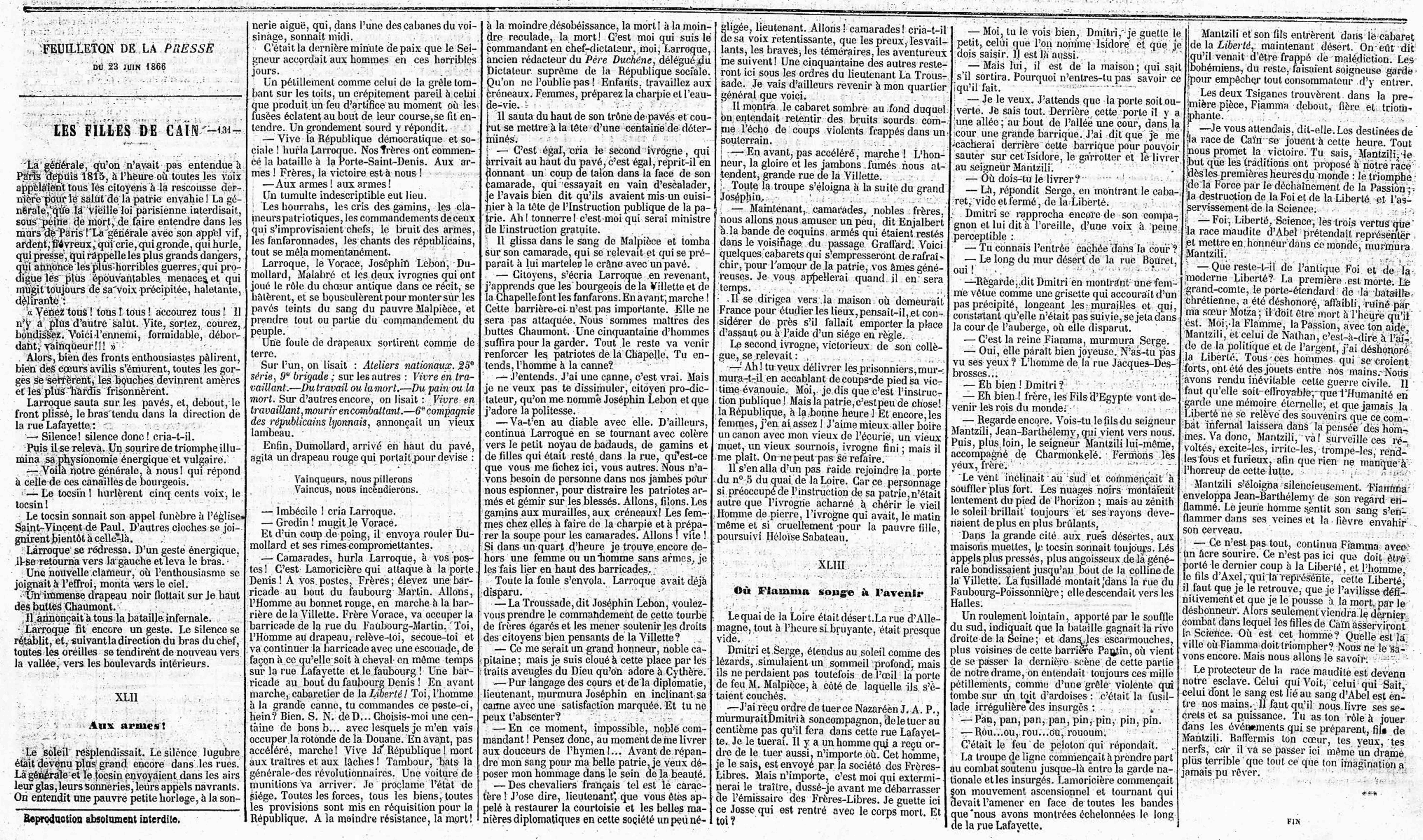 L’extrait reproduit dans l’article du Figaro correspond au chapitre XXI des Filles de Caïn, « Les Dieux tonnent » (dix-neuvième livraison, mardi 10 octobre 1865).