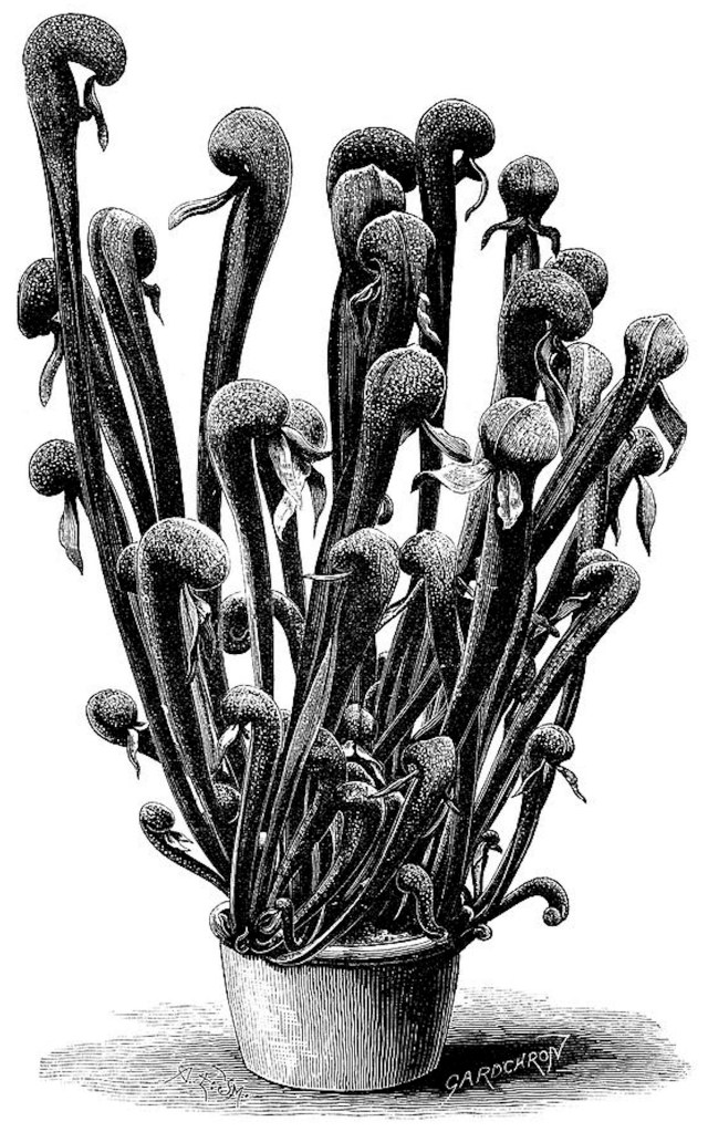 (Albert-Jean, « Les Mille et un matins, » in Le Matin, cinquante-sixième année, n° 20290, jeudi 12 octobre 1939 ; gravure représentant une plante cobra [Darlingtonia californica], extraite de la revue La Science illustrée, 1892)