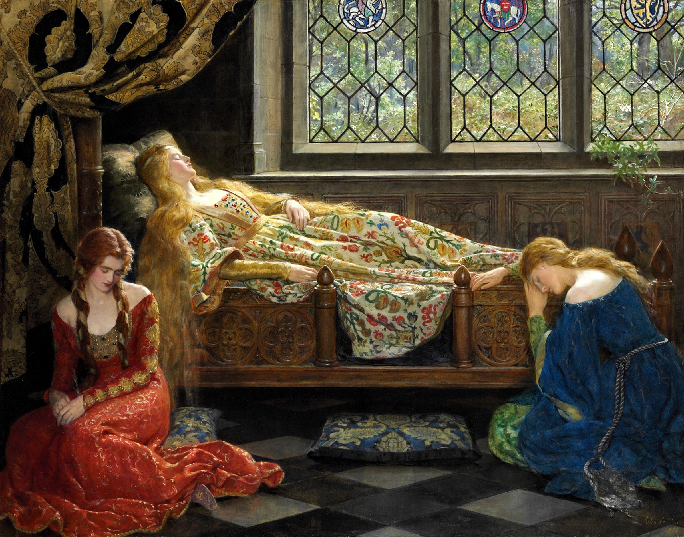 (Anonyme, « Légendes polonaises, » in Le Petit Caporal, journal impérialiste quotidien, vingtième année, n° 22, jeudi 24 janvier 1895 ; repris dans La Souveraineté nationale, dixième année, n° 2817, vendredi 25 janvier 1895 ; Le Constitutionnel, quatre-vingt-et-unième année, n° 29290, samedi 26 janvier 1895 ; L’Étendard, journal du soir, treizième année, samedi 26 janvier 1895 ; Le Libéral, journal quotidien politique, samedi 26 janvier 1895 ; Le Pays républicain, cinquantième année, n° 17896, samedi 26 janvier 1895 ; L’Ordre et l’Union française réunis, journal du soir politique quotidien, dix-huitième année, n° 23, dimanche 27 janvier 1895. John Collier, « The Sleeping Beauty, » huile sur toile, 1921)