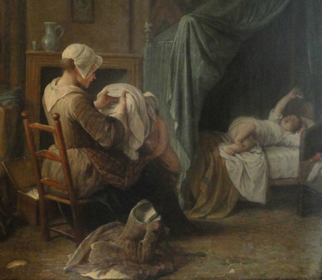 (Octave Béliard, « Nouvelles, » in Le Soleil, trente-cinquième année, n° 98, mardi 7 avril 1908 ; Pierre-Louis Dumesnil (le jeune), « Servante habillant des enfants » [détail], huile sur toile, c. 1750)