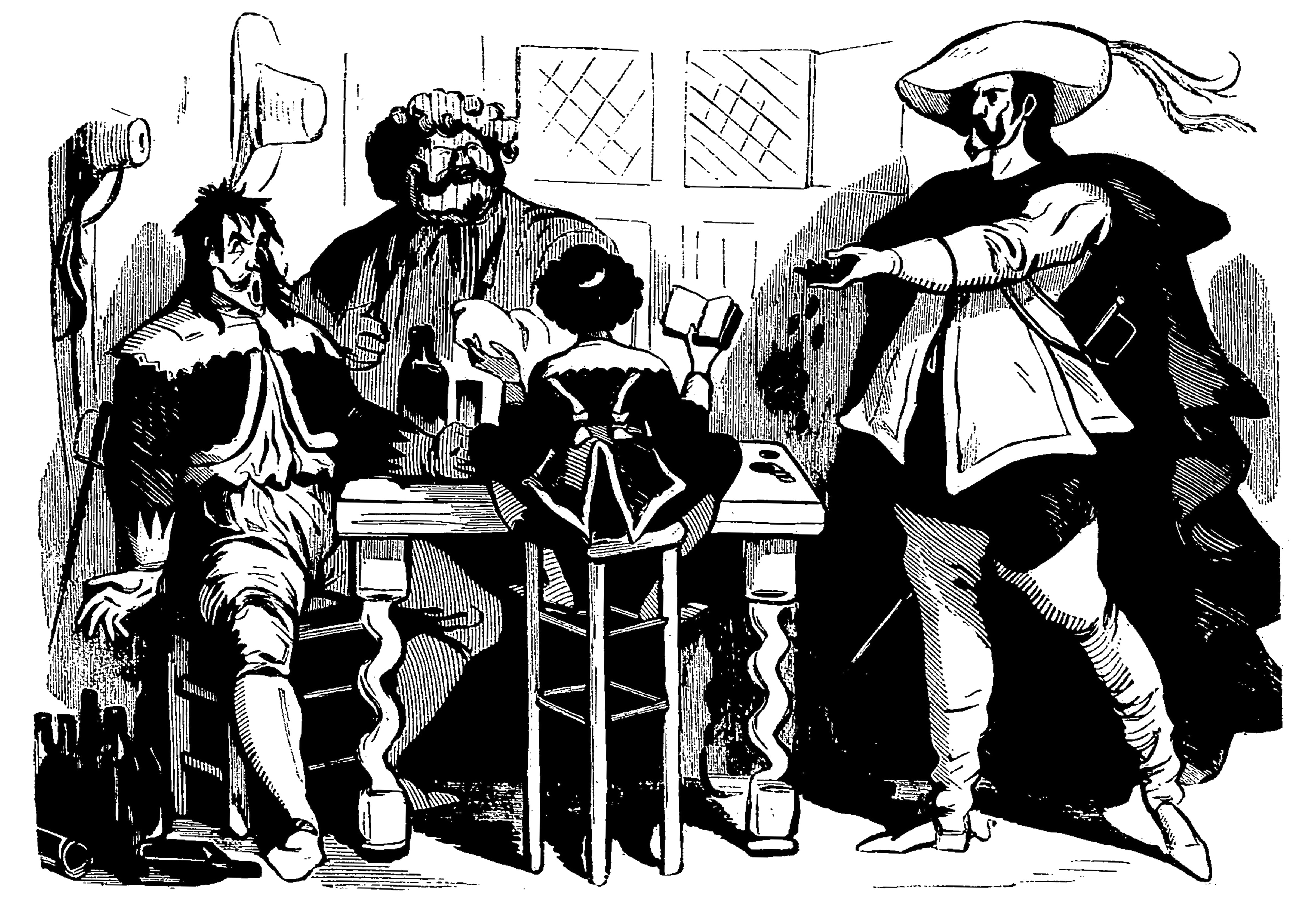 (Léon Leconte, in L’Étudiant, écho du quartier latin, dixième année, n° 273, samedis 20 et 27 juillet 1901 ; repris dans Le Petit Soleil, supplément du Soleil, journal politique et littéraire du matin, neuvième année, n° 44 et 45, samedis 2 et 9 novembre 1901 ; illustrations d’Émile Marcelin pour Les Trois ou quatre Mousquetaires, d’après Alexandre Dumas, in Le Journal pour rire, nouvelle série, n° 105, samedi 1er octobre 1853 ; frontispice de Maurice Leloir, gravé par Jules Huyot, pour Les Trois Mousquetaires d’Alexandre Dumas, Paris : Calmann Lévy, 1894)