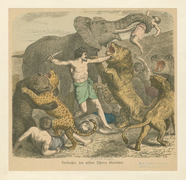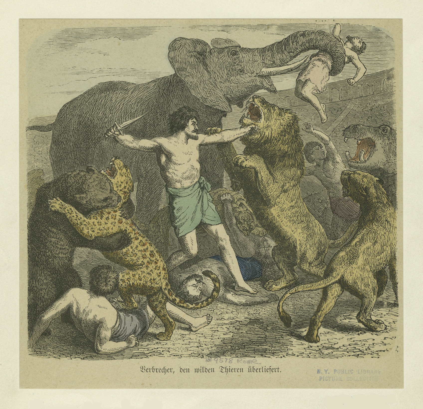 (Henry Kistemaeckers, in L’Auto, cinquième année, n° 1398, mercredi 10 août 1904 ; « Verbrecher, den wilden Thieren überliefert, » gravure sur bois, c. 1852)