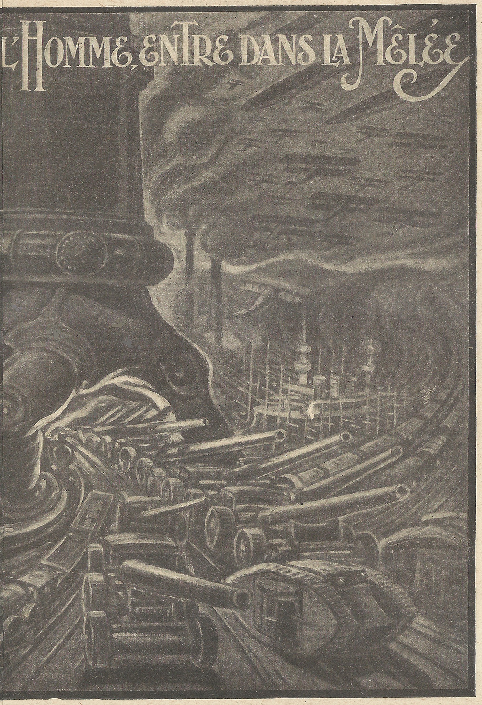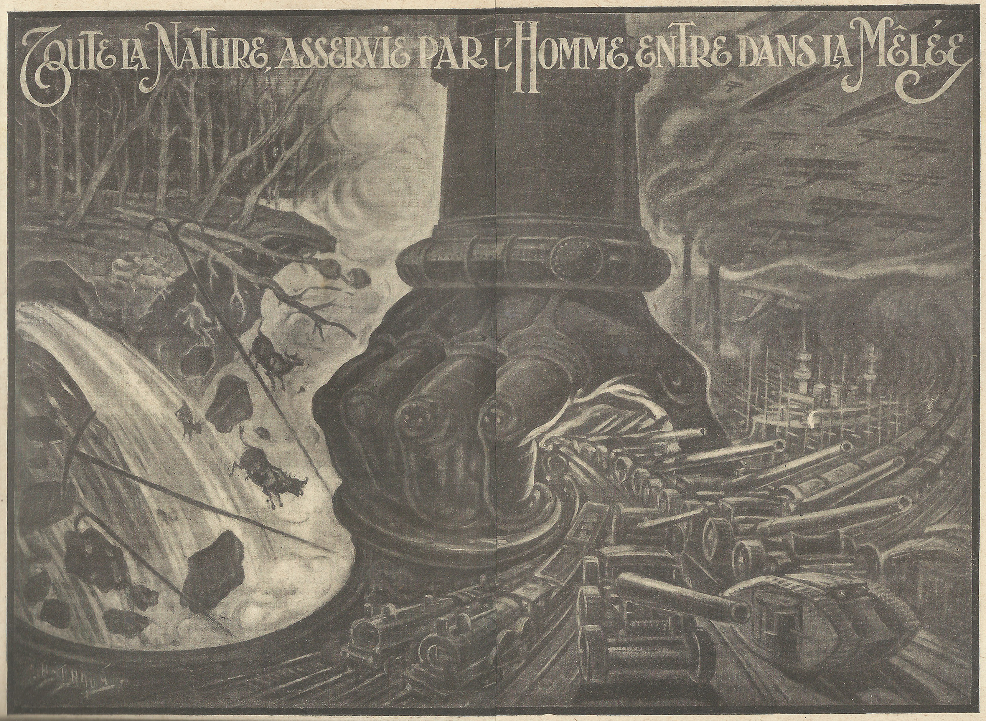 Dans cette guerre scientifique, qui emploie des engins si multiples et des moyens si perfectionnés, il n’y a pas un élément de la nature qui ne soit mis à contribution. Que ce soit sur terre ou sous terre, à la surface ou au sein des mers, à travers les airs, dans le monde animé ou inanimé, il n’est pas un être, pas une plante, pas une substance qui ne soit utilisée pour la lutte gigantesque. Imaginez pour un instant qu’un homme de la préhistoire s’éveille de son sommeil tant de fois séculaire… Quel ne serait pas son étonnement devant les prodiges d’invention réalisés par ses arrière-petits-neveux !