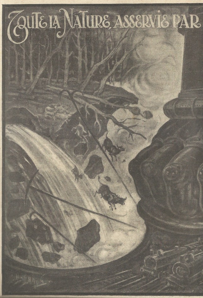 – C’est notre cheval d’acier. La fumée est sa respiration. Et voyez quelle force ! Il boit de l’eau. Il mange. Mais, au fait, ce qu’il mange est beaucoup plus vieux que vous-même. Il mange des troncs d’arbres et des herbes qui végétaient des milliers d’années avant votre naissance et dont vous ne soupçonnâtes pas l’existence. Ces végétaux sont si vieux qu’ils se sont changés en une sorte de roche, la houille, que la terre a recouverte avec le temps et que nous avons retrouvée à cinq cents ou mille mètres de profondeur, en creusant des puits. La terre ne cesse de nous en livrer et nous de lui en arracher, car c’est peut-être notre plus inappréciable richesse. C’est la houille qui, brûlant, donne la vie à presque toutes nos machines, encore que maintenant les torrents qui coulent des montagnes lui font concurrence en nous procurant également la force motrice (car nous avons aussi le torrent, le fleuve et la mer pour alliés). Singulière chose que des plantes mortes depuis cent mille ans ou beaucoup plus, fassent aujourd’hui la guerre !