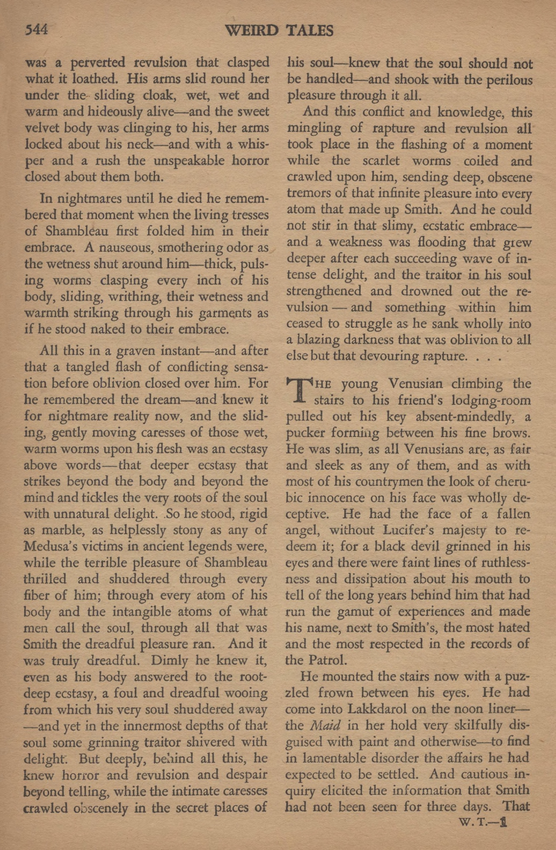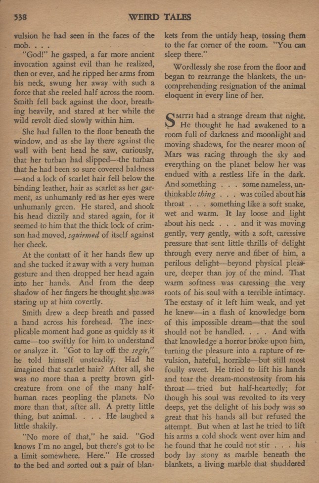 Smith eut un rêve étrange, cette nuit-là. Quelque chose sans nom, inimaginable, était enroulé autour de sa gorge, comme un serpent, souple, humide et chaud. Cela bougeait doucement, très doucement, avec une pression caressante qui faisait passer des petits frissons de délices dans tous ses nerfs et toutes ses fibres – au-delà d’un plaisir physique, plus profond que la joie de l’esprit. Une horreur lui vint. Il tenta d’arracher cette monstruosité de cauchemar de son cou – mais sans conviction ; car bien qu’il fût révolté jusqu’au plus profond de lui-même, le délice était si grand que ses mains refusaient cet effort.