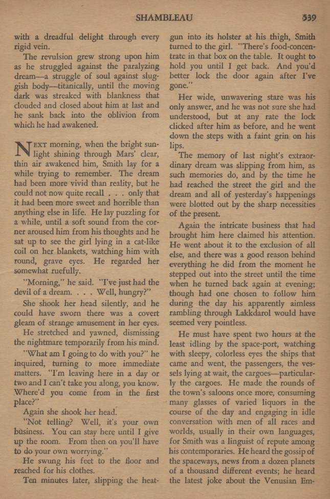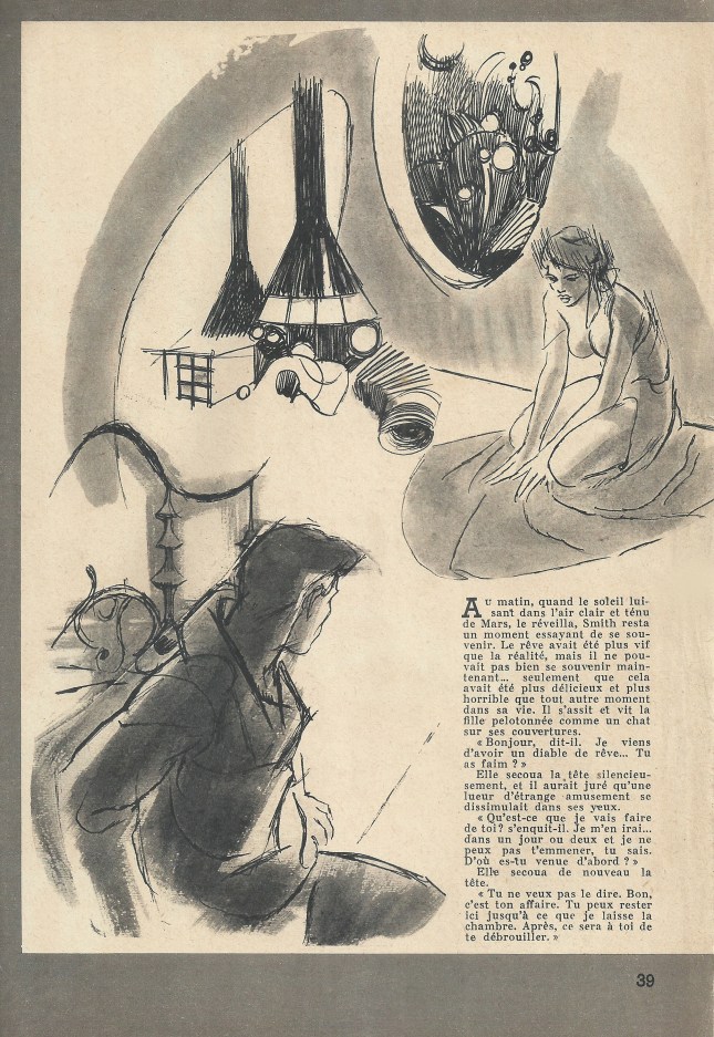 Au matin, quand le soleil, luisant dans l’air clair et ténu de Mars, le réveilla, Smith resta un moment essayant de se souvenir. Le rêve avait été plus vif que la réalité, mais il ne pouvait pas bien se souvenir maintenant… seulement que cela avait été plus délicieux et plus horrible que tout autre moment dans sa vie. Il s’assit et vit la fille pelotonnée comme un chat sur ses couvertures.