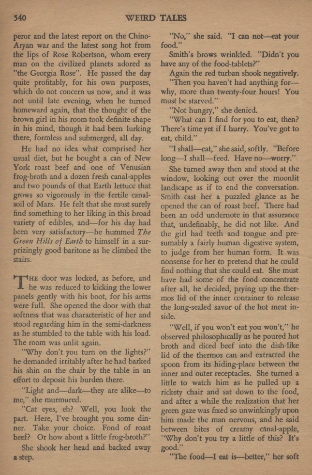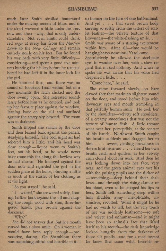 Il la prit aux épaules, des épaules d’une douceur satinée qui n’était pas celle de la peau humaine. Un petit frémissement passa sur elle, au contact de ses mains. Northwest Smith perdit soudain la respiration et l’attira à lui. Elle se laissa aller dans ses bras. Il l’entendit respirer plus vite tandis que les bras veloutés se fermaient autour de son cou. Alors, il regarda son visage, tout près, et les yeux verts d’animal rencontrèrent les siens, avec leurs pupilles palpitantes et la lueur de quelque chose, caché tout au fond.