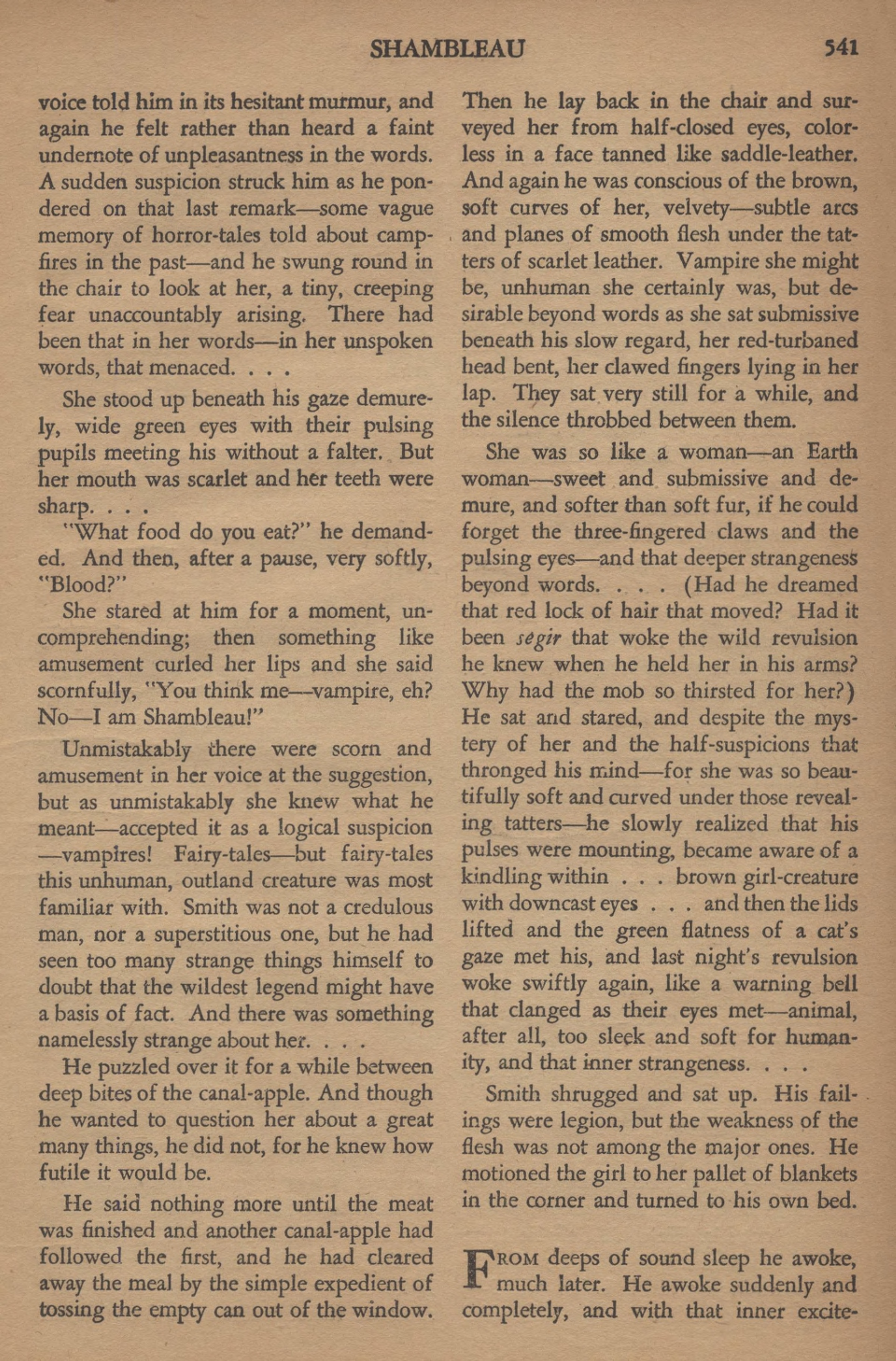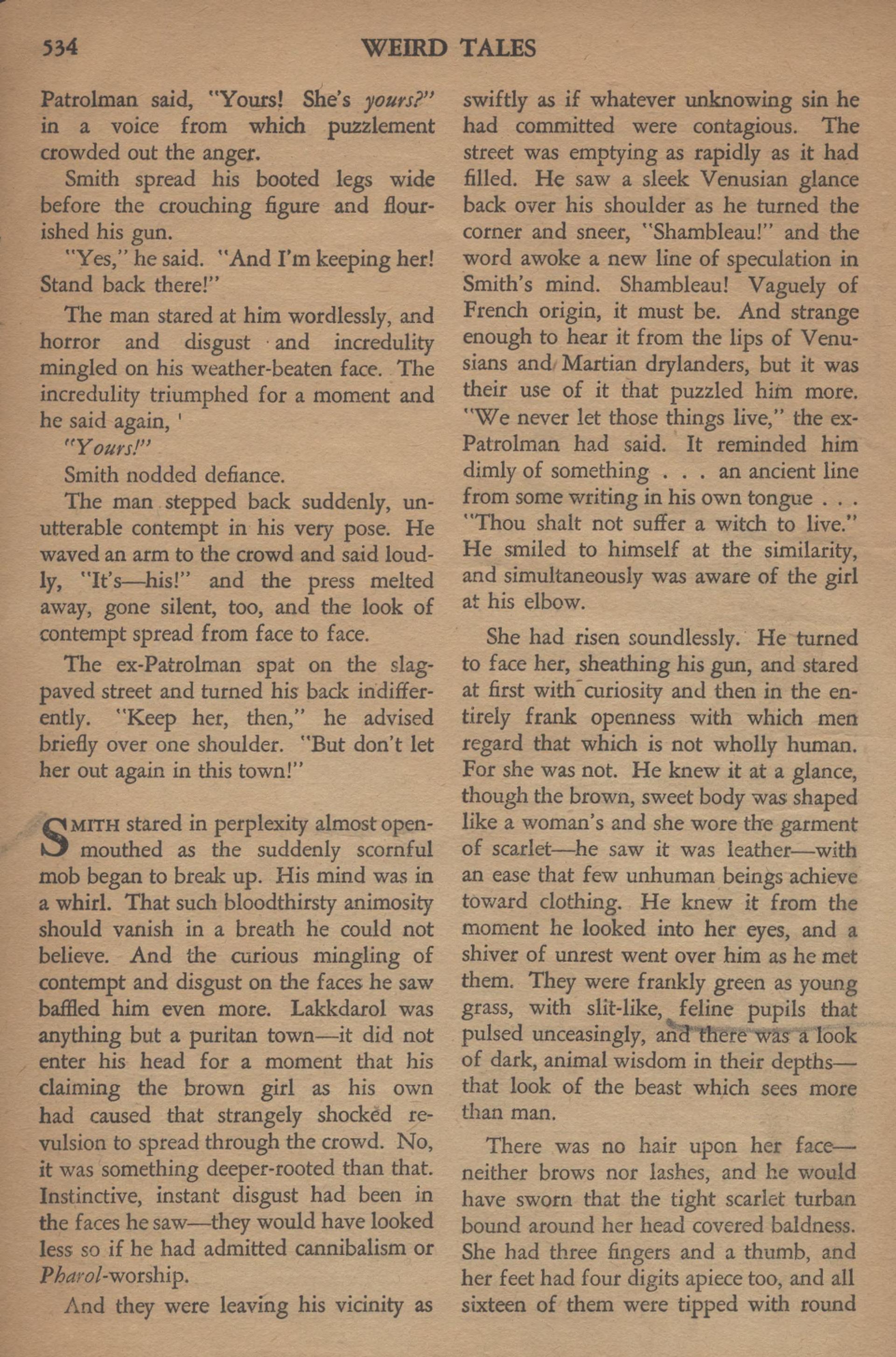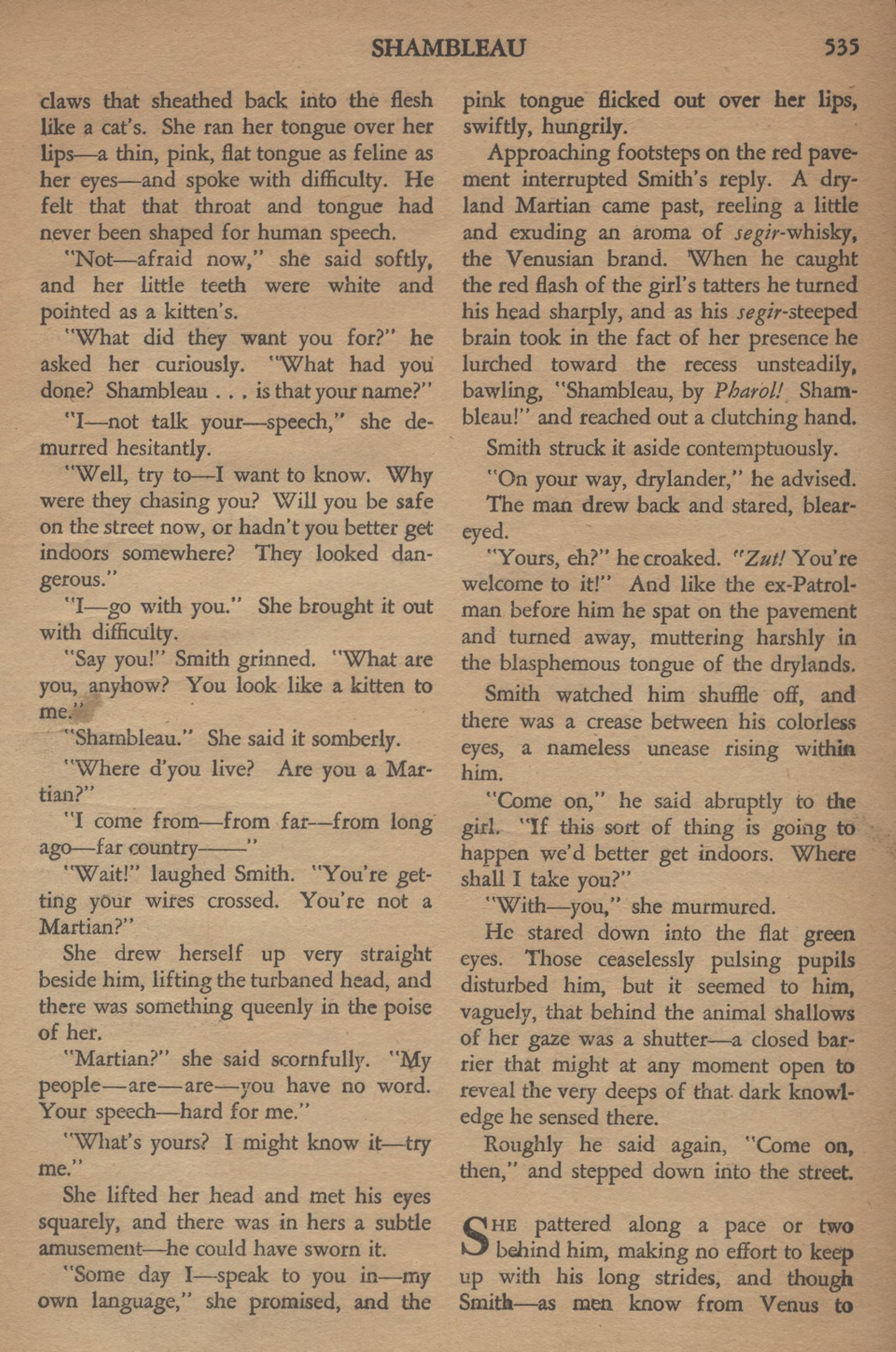La rue se vidait aussi rapidement qu’elle s’était remplie. Un Vénusien ricana : « Shambleau ! » Le mot éveilla une nouvelle chaîne de spéculation dans l’esprit de Smith et, juste à ce moment, il sentit la fille près de lui.