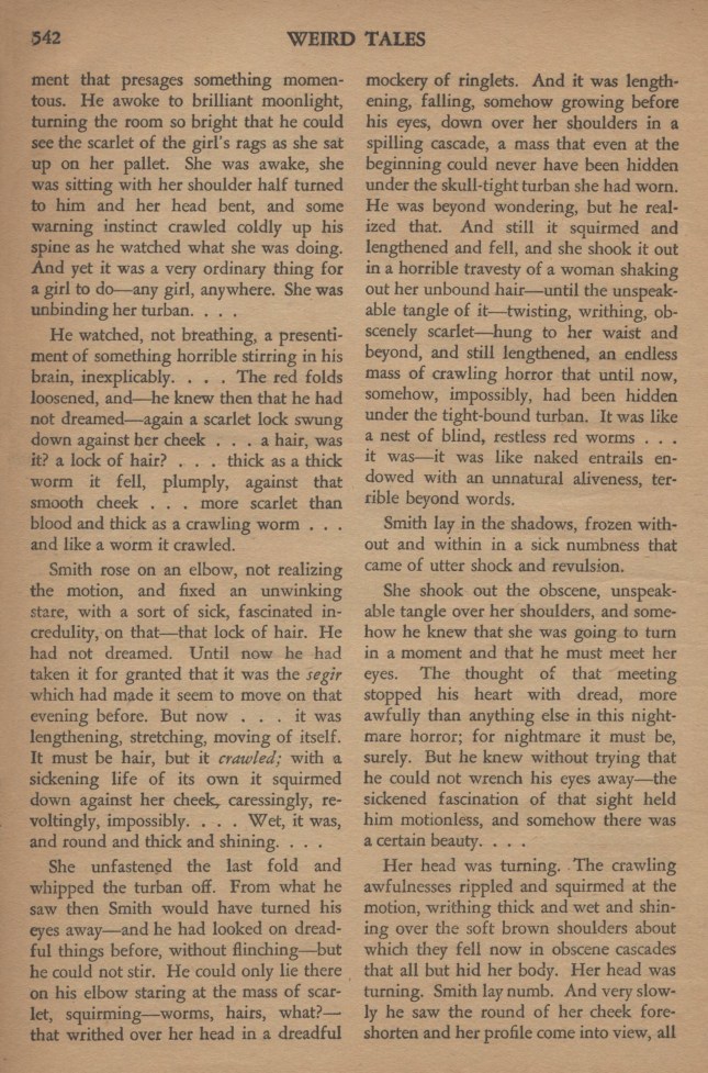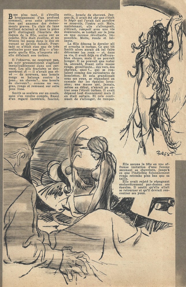 La fille dénoua le dernier pli et arracha le turban. Ce que vit Smith alors aurait dû lui faire détourner les yeux – et, dans sa vie, il avait déjà vu d’effroyables choses, mais il ne pouvait bouger. Il ne pouvait que rester là, accoudé, fixant cette masse rouge, grouillante… des vers, des cheveux, quoi ?… qui se roulaient comme des caricatures de bouclettes. Et cela grandissait sous ses yeux, se répandant en cascade sur les épaules bronzées ; une masse qui, jamais, même au début, n’aurait pu entrer sous l’étroit turban. Il avait dépassé tout étonnement, mais il en était certain. Et cela continuait de s’allonger, de ramper.