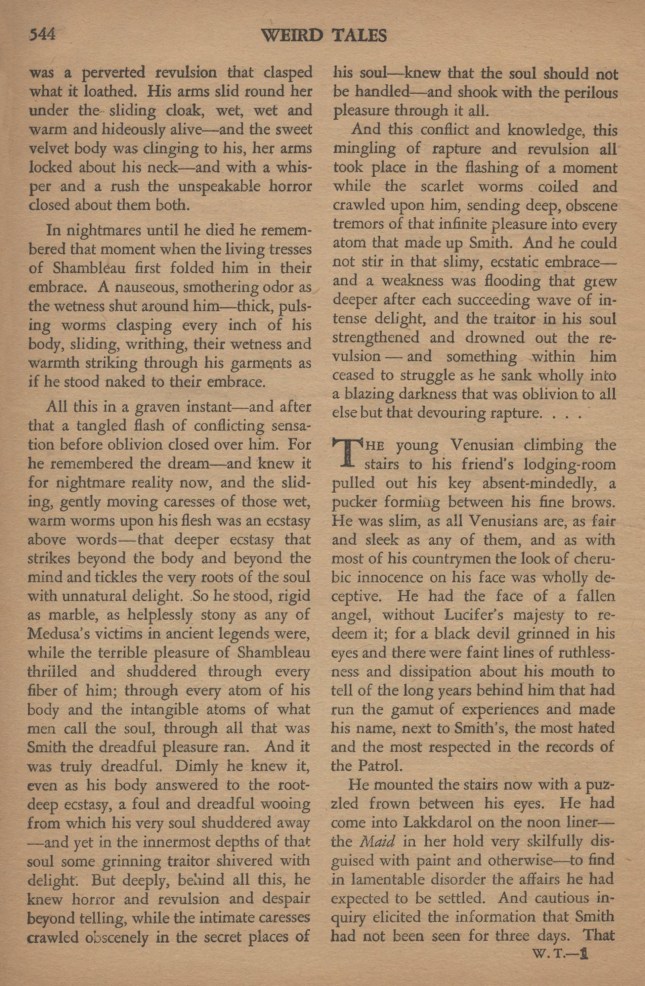 Yarol posa la main sur son pistolet et ouvrit la porte toute grande. Dans l’obscurité, il n’aperçut d’abord qu’une masse bizarre dans le coin le plus éloigné. Puis ses yeux s’accoutumèrent et il vit mieux : une masse qui semblait animée intérieurement. Une masse – il retint son souffle – comme un tas d’entrailles grouillantes d’une vie immonde. Alors, un juron vénusien lui échappa ; il franchit le seuil d’une enjambée, claqua la porte et s’y adossa, l’arme à la main, bien que toute sa chair se hérissât – car il savait.