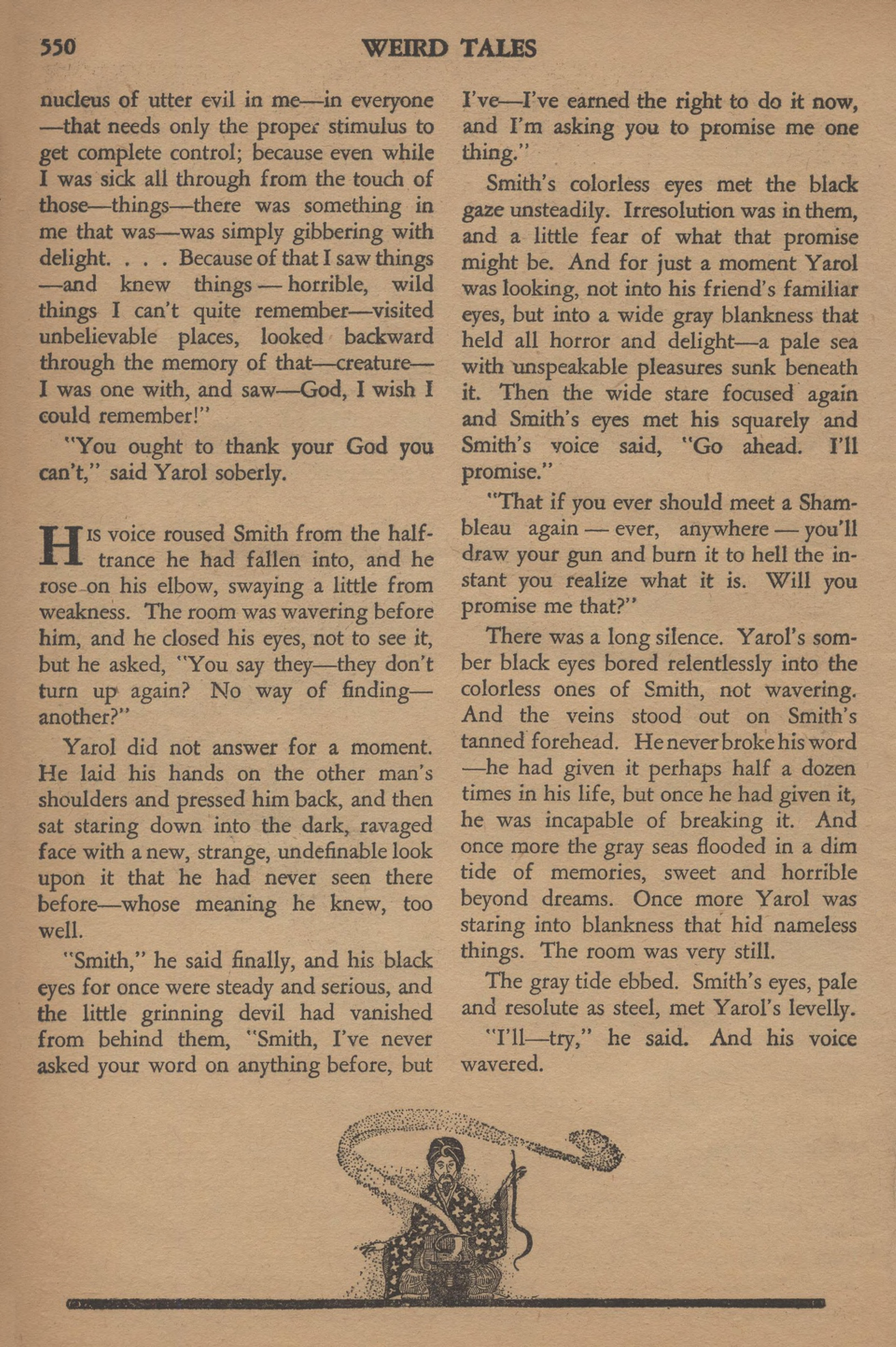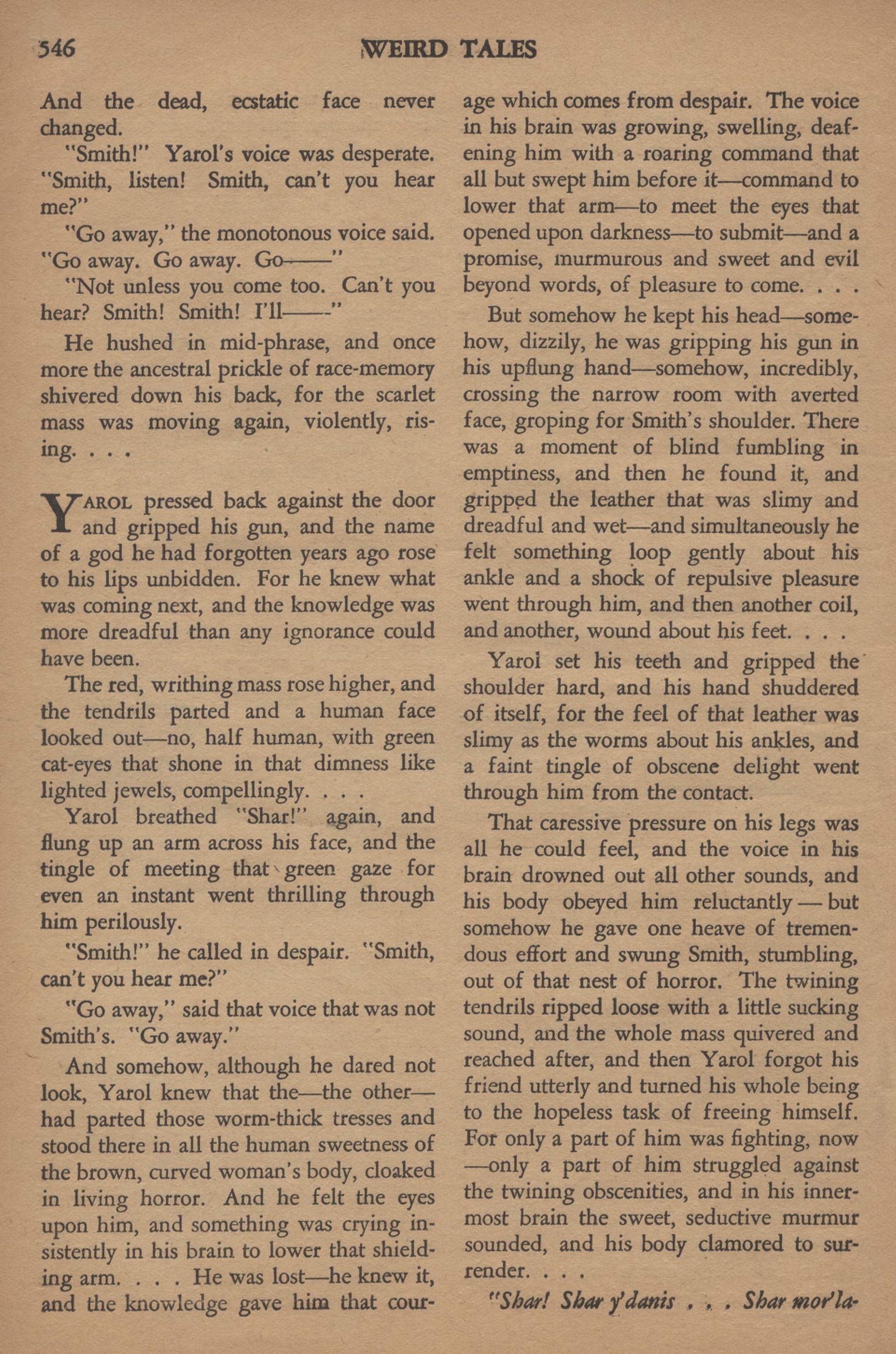 Les yeux pâles de Smith rencontrèrent le regard noir. Un instant, Yarol vit non pas les yeux familiers de son ami, mais des immensités grises qui contenaient toute l’horreur et toutes les délices – un océan pâle noyant un indicible plaisir. Puis le regard immense se rétrécit et les yeux de Smith se plantèrent droit dans les siens.