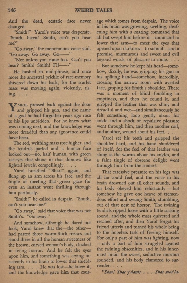 Ce conflit de ravissement et de répulsion ne dura que l’éclair d’un instant, quand les vers rouges s’enroulèrent autour de lui, et une faiblesse l’envahit, plus profonde, à chaque onde d’intense délice. Quelque chose en lui cessa de lutter et il sombra dans de fulgurantes ténèbres où tout était oublié, sauf cette extase dévorante…