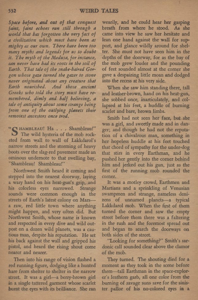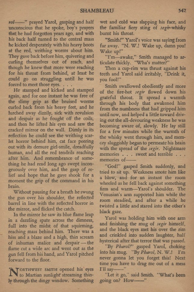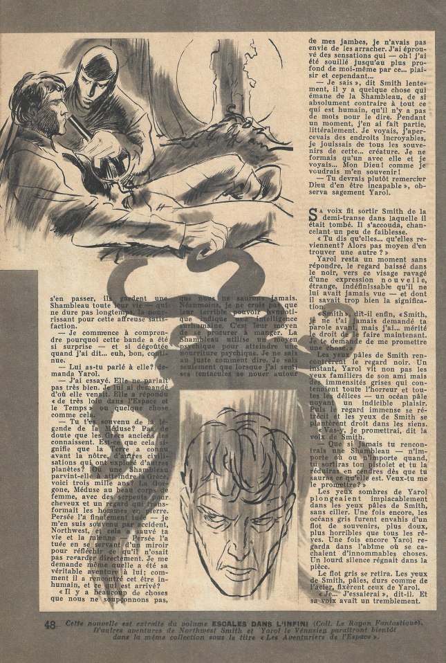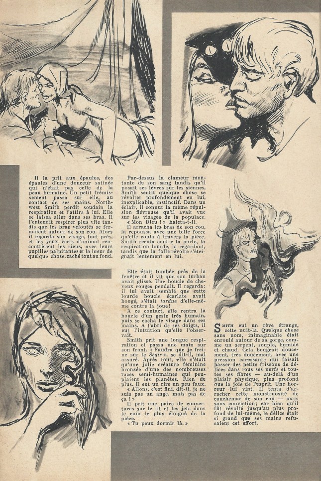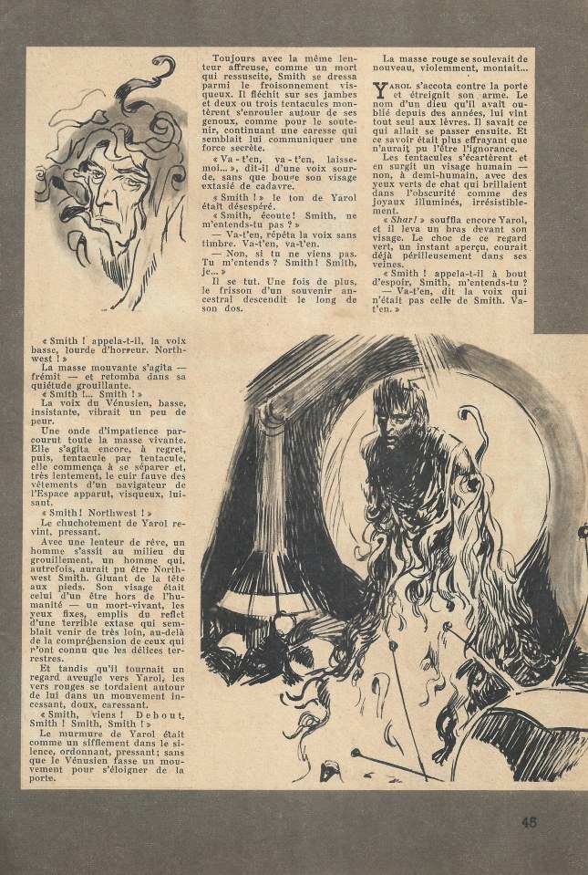 Avec une lenteur de rêve, un homme s’assit au milieu du grouillement, un homme qui, autrefois, aurait pu être Northwest Smith. Gluant de la tête aux pieds. Son visage était celui d’un être hors de l’humanité – un mort-vivant, les yeux fixes, emplis du reflet d’une terrible extase qui semblait venir de très loin, au-delà de la compréhension de ceux qui n’ont connu que les délices terrestres.