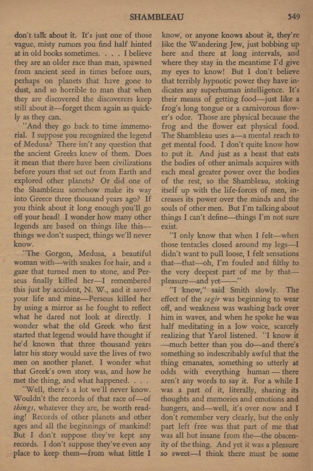 Il y a beaucoup de choses que nous ne soupçonnons pas, que nous ne saurons jamais. Néanmoins, je ne crois pas que leur terrible pouvoir hypnotique indique une intelligence surhumaine. C’est leur moyen de se procurer à manger. La Shambleau utilise un moyen psychique pour atteindre une nourriture psychique. Je ne sais au juste comment dire. Je sais seulement que lorsque j’ai senti ses tentacules se nouer autour de mes jambes, je n’avais pas envie de les arracher. J’ai éprouvé des sensations qui – oh ! j’ai été souillé jusqu’au plus profond de moi-même par ce… plaisir et cependant…