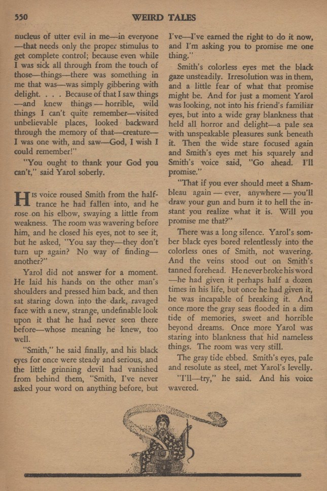 Smith avait vu trop de choses étranges pour douter que les plus folles légendes pussent avoir une base de vérité. Et il y avait en elle quelque chose d’infiniment étrange. La répulsion de la nuit précédente se réveilla promptement comme un signal d’alarme… Smith haussa les épaules.
