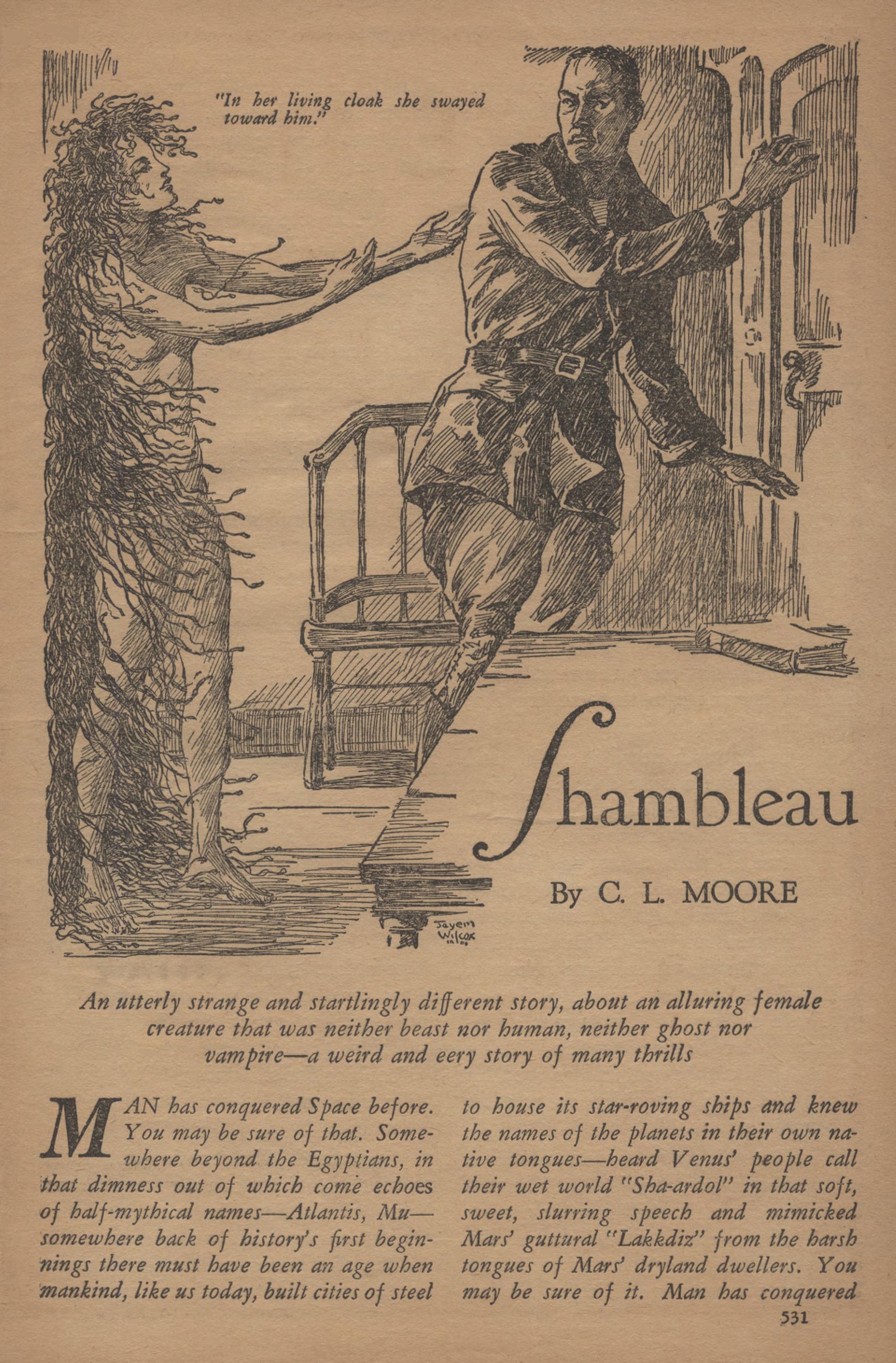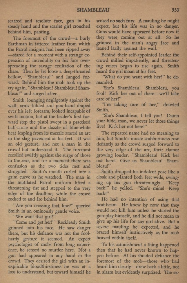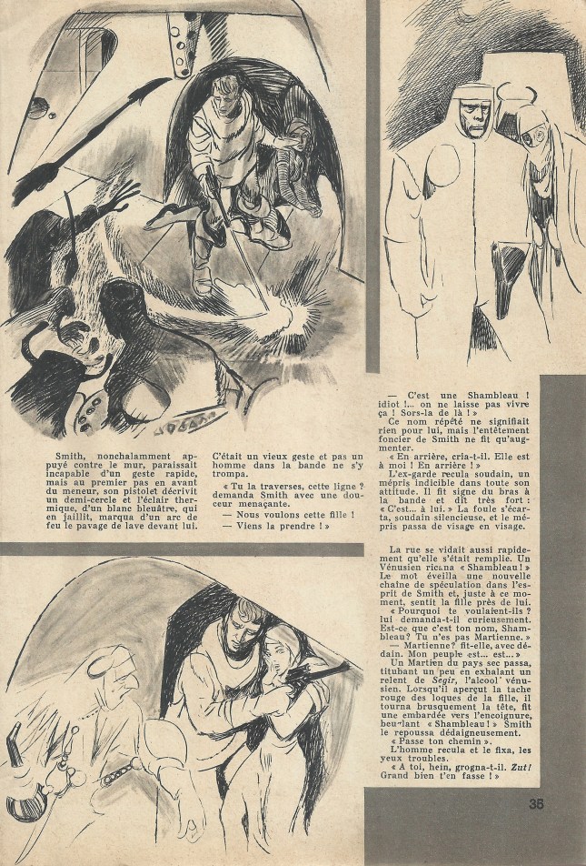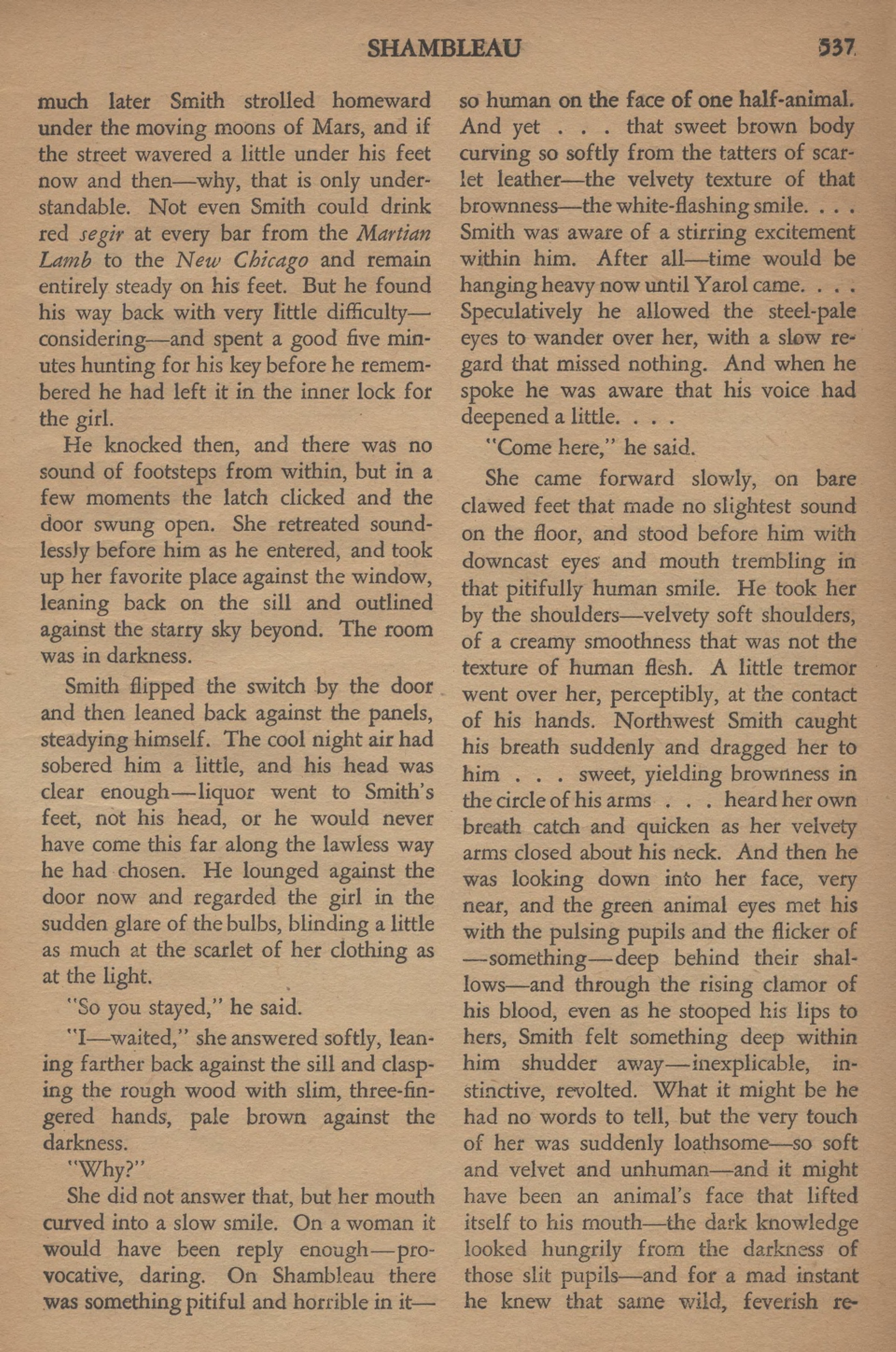 Un Martien du pays sec passa, titubant un peu en exhalant un relent de Segir, l’alcool vénusien. Lorsqu’il aperçut la tache rouge des loques de la fille, il tourna brusquement la tête, fit une embardée vers l’encoignure, beuglant : « Shambleau ! » Smith le repoussa dédaigneusement.