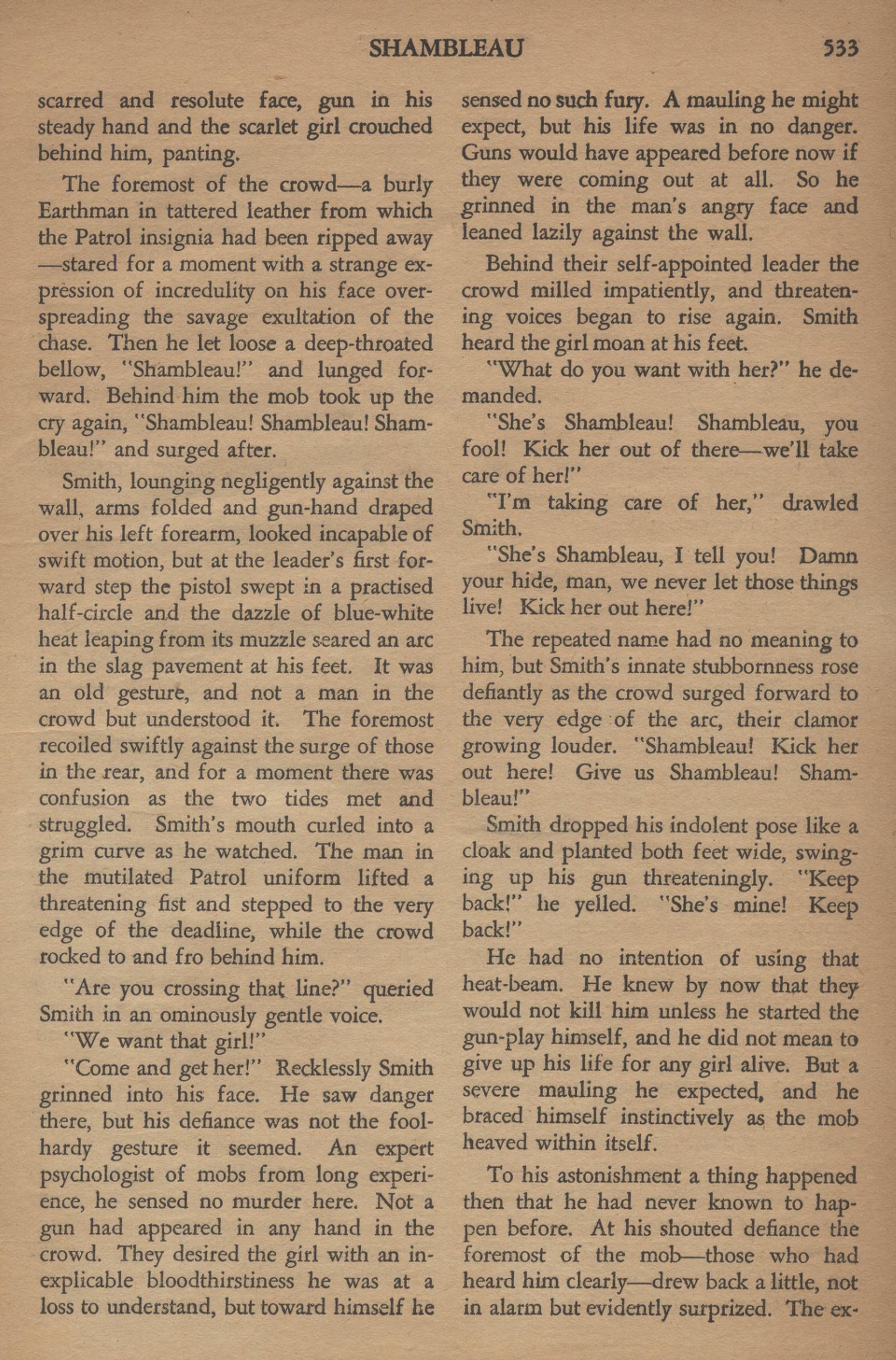 Puis, il lança un beuglement profond : « Shambleau ! » et se précipita en avant. Derrière lui, la foule reprit le cri : « Shambleau ! Shambleau ! Shambleau ! » et se rua à sa suite.