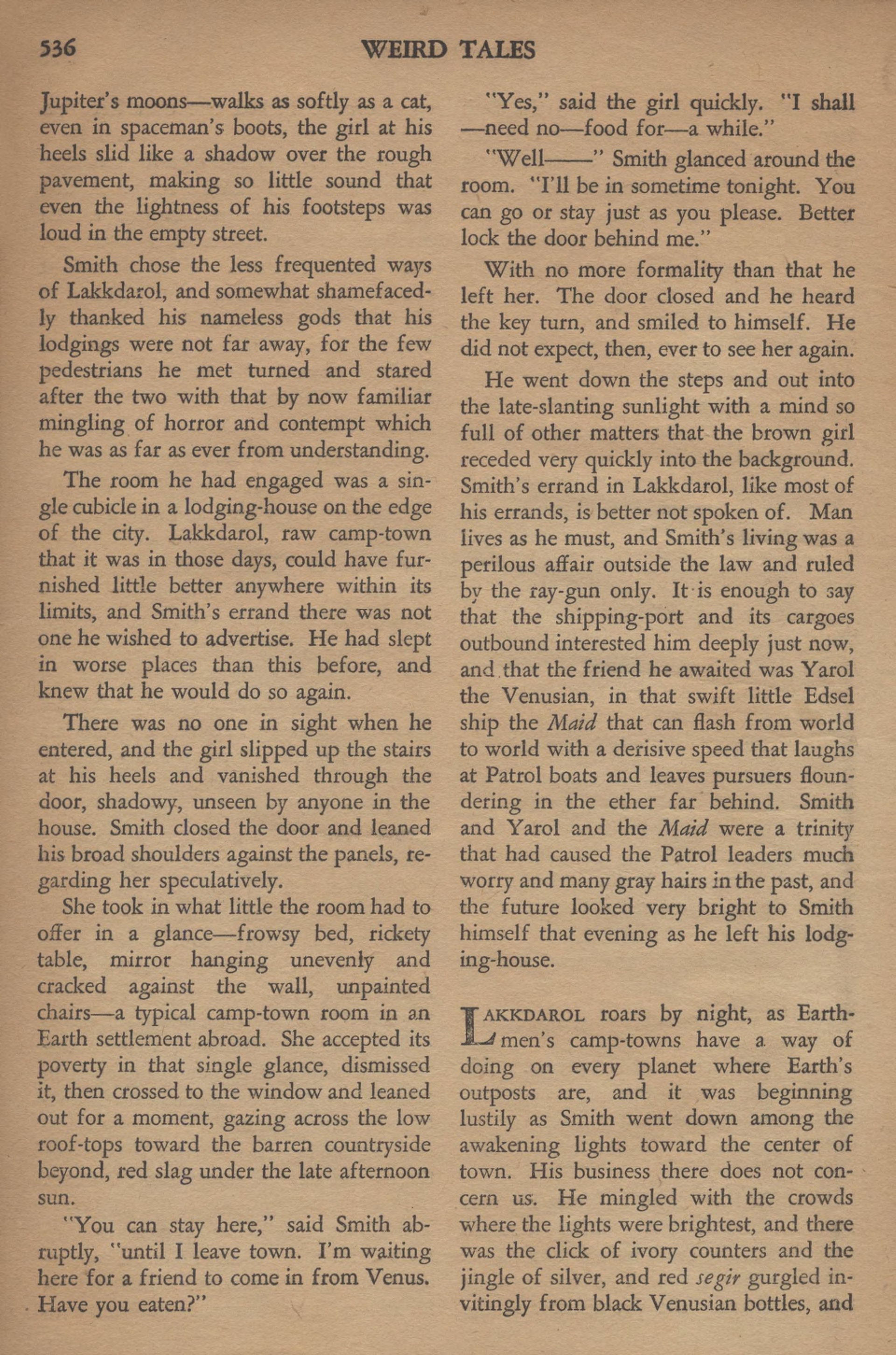 La chambre qu’il avait louée était une petite pièce dans une bâtisse aux confins de la ville. Lakkdarol, rude ville campement de pionniers, à cette époque, n’aurait guère fourni plus de confort n’importe où ailleurs, et Smith ne tenait pas à faire savoir ce qui l’avait amené là. Personne ne le vit entrer, la fille sur ses pas. Smith ferma la porte et appuya ses larges épaules contre le panneau, la regardant pensivement.