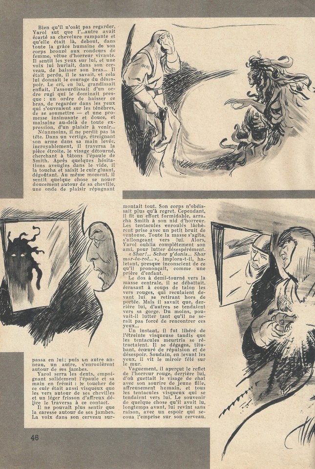 Bien qu’il n’osât pas regarder, Yarol sut que l’… autre avait écarté sa chevelure rampante et qu’elle était là, debout, dans toute la grâce humaine de son corps bronzé aux rondeurs de femme, vêtue d’horreur vivante. Il sentit les yeux sur lui, et une voix lui hurlait, dans son cerveau, de baisser son bras… Il était perdu, il le savait, et cela lui donnait le courage du désespoir. Le cri, en lui, grandissait, enflait, l’assourdissait d’un ordre rugi qui le dominait presque : un ordre de baisser ce bras, de regarder dans les yeux qui s’ouvraient sur les ténèbres, de se soumettre – et une promesse insinuante et douce, et malsaine au-delà de toute expression, d’un plaisir à venir…