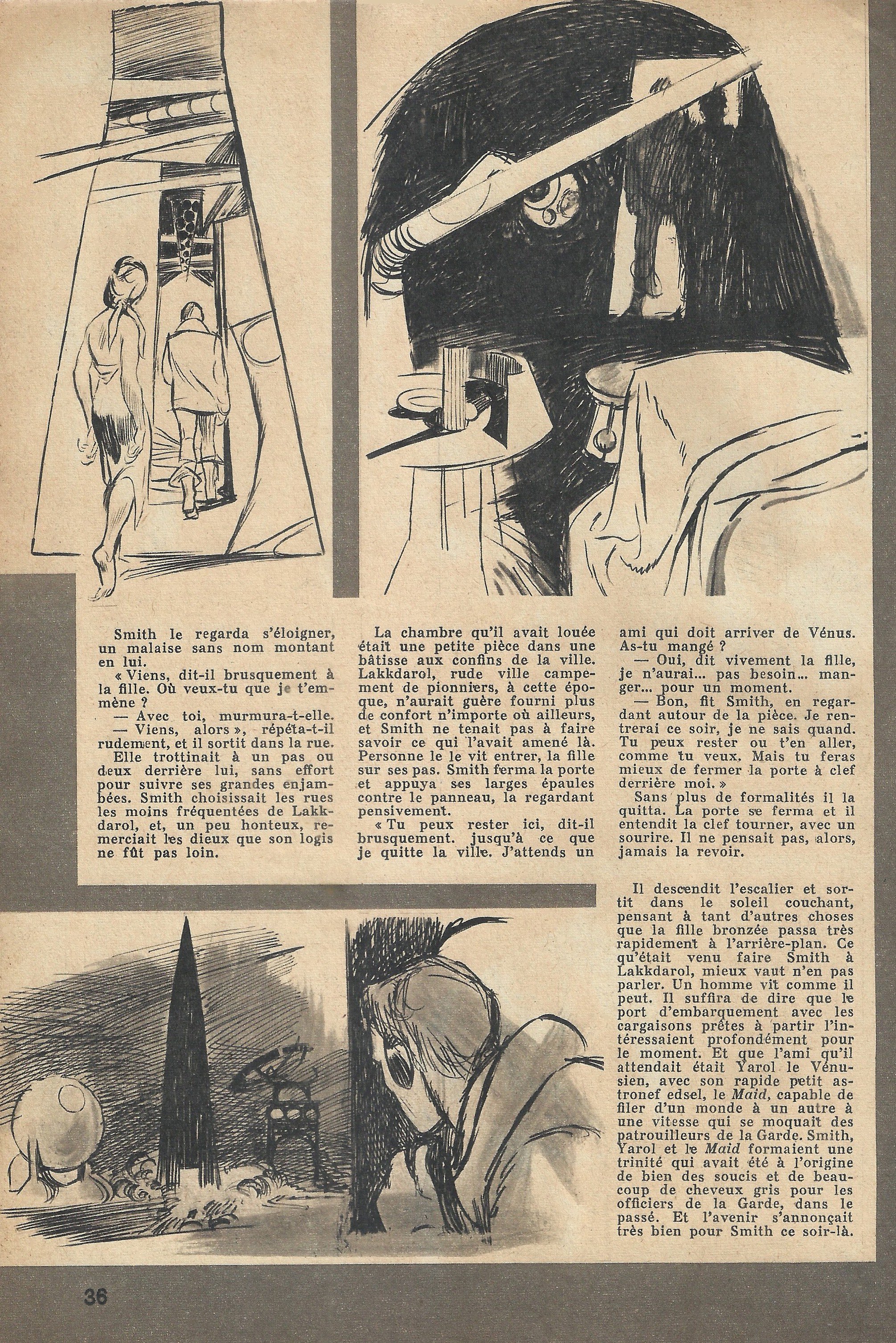 Il descendit l’escalier et sortit dans le soleil couchant, pensant à tant d’autres choses que la fille bronzée passa très rapidement à l’arrière-plan. Ce qu’était venu faire Smith à Lakkdarol, mieux vaut n’en pas parler. Un homme vit comme il peut. Il suffira de dire que le port d’embarquement avec les cargaisons prêtes à partir l’intéressaient profondément pour le moment. Et que l’ami qu’il attendait était Yarol le Vénusien, avec son rapide petit astronef edsel, le Maid, capable de filer d’un monde à un autre à une vitesse qui se moquait des patrouilleurs de la Garde. Smith, Yarol et le Maid formaient une trinité qui avait été à l’origine de bien des soucis et de beaucoup de cheveux gris pour les officiers de la Garde, dans le passé. Et l’avenir s’annonçait très bien pour Smith ce soir-là.