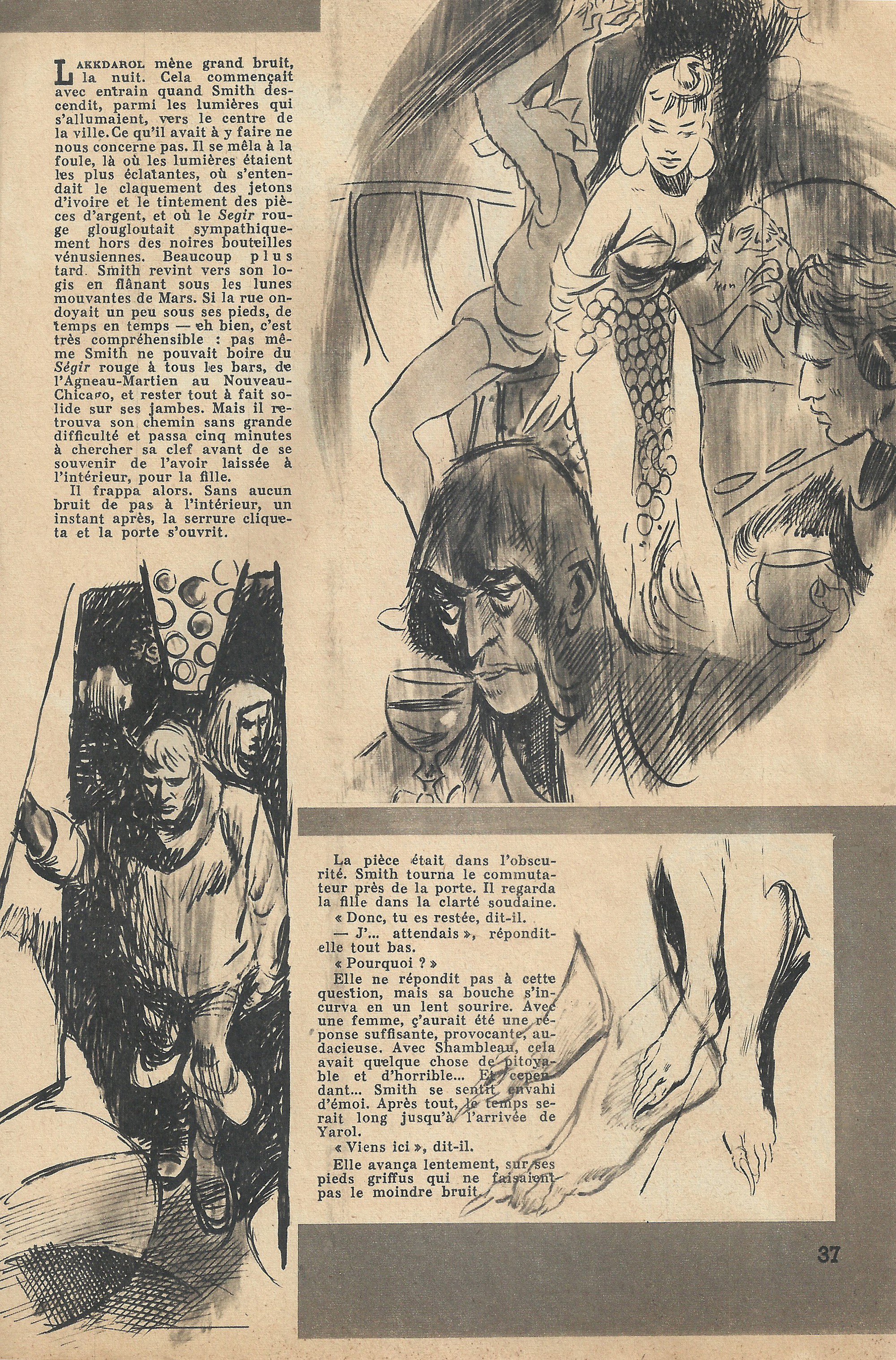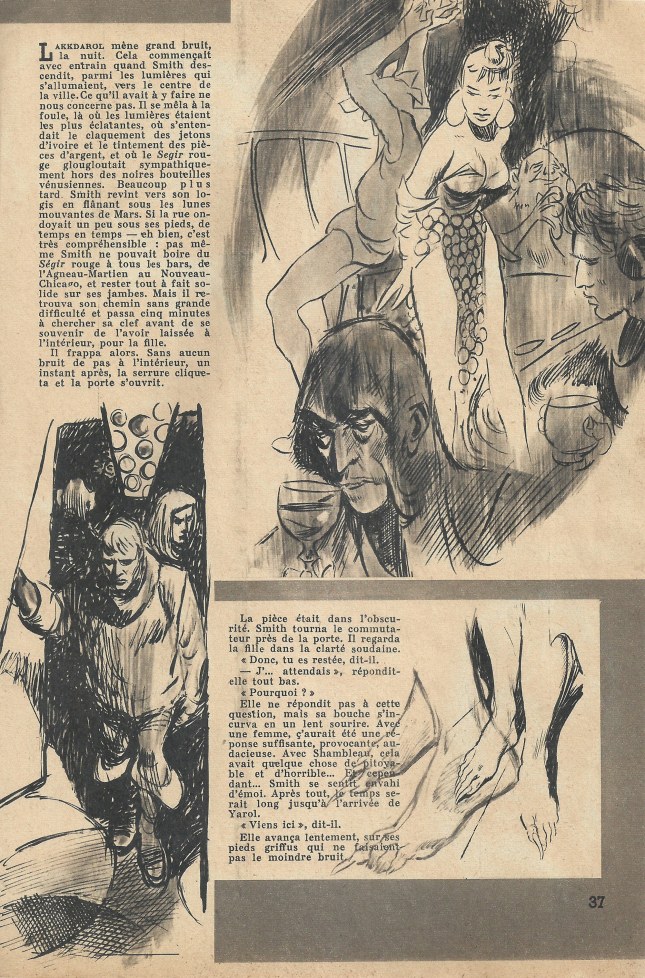 Lakkdarol mène grand bruit, la nuit. Cela commençait avec entrain quand Smith descendit, parmi les lumières qui s’allumaient, vers le centre de la ville. Ce qu’il avait à y faire ne nous concerne pas. Il se mêla à la foule, là où les lumières étaient les plus éclatantes, où s’entendait le claquement des jetons d’ivoire et le tintement des pièces d’argent, et où le Segir rouge glougloutait sympathiquement hors des noires bouteilles vénusiennes. Beaucoup plus tard, Smith revint vers son logis en flânant sous les lunes mouvantes de Mars. Si la rue ondoyait un peu sous ses pieds, de temps en temps – eh bien, c’est très compréhensible : pas même Smith ne pouvait boire du Segir rouge à tous les bars, de l’Agneau-Martien au Nouveau-Chicago, et rester tout à fait solide sur ses jambes. Mais il retrouva son chemin sans grande difficulté et passa cinq minutes à chercher sa clef avant de se souvenir de l’avoir laissée à l’intérieur, pour la fille.