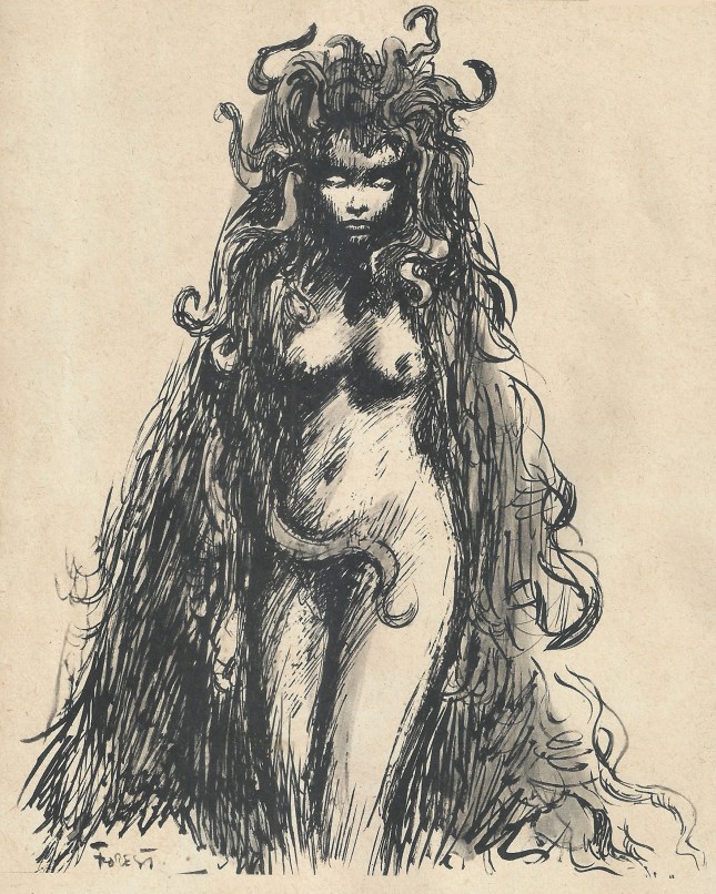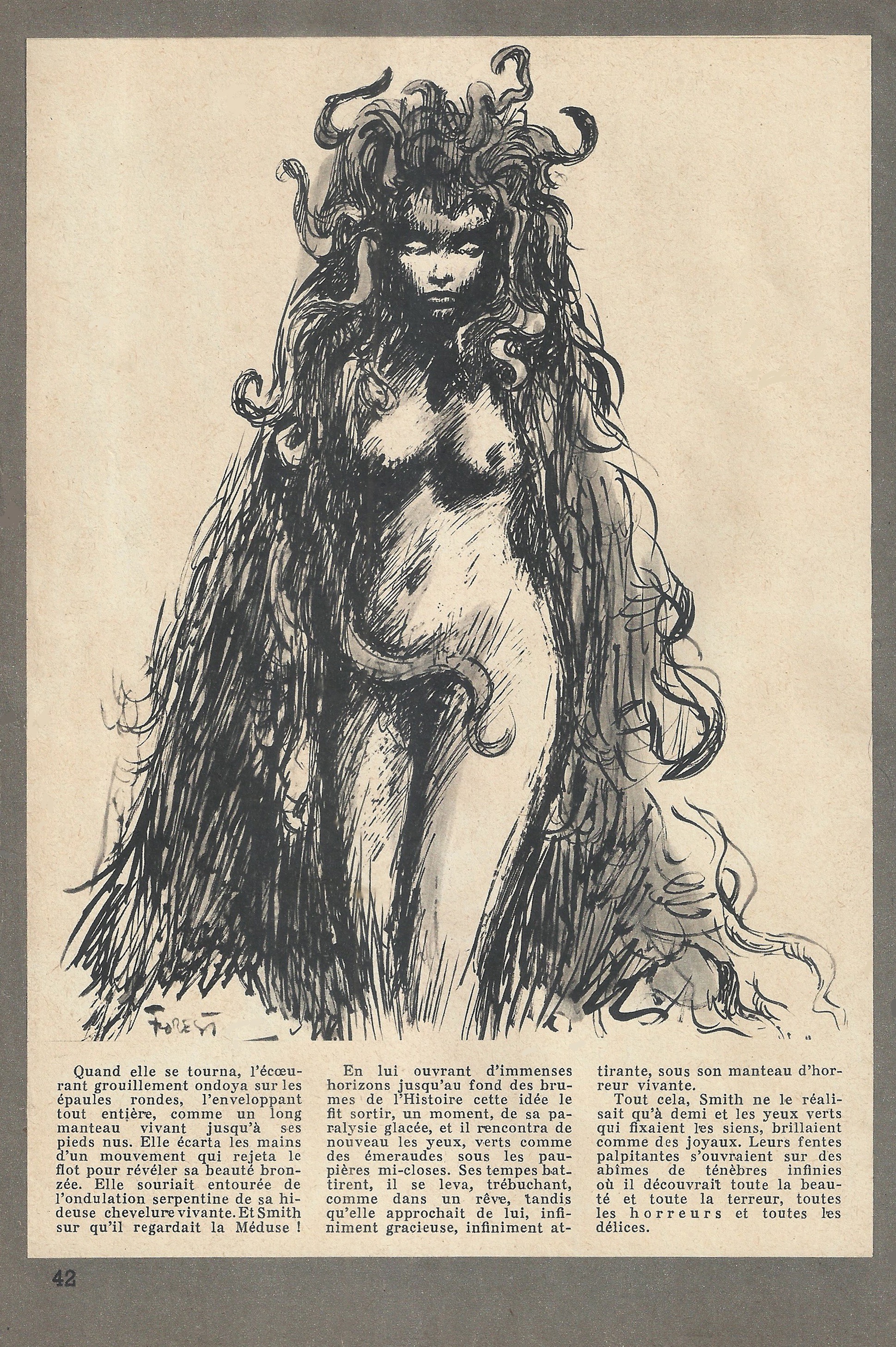 Quand elle se tourna, l’écœurant grouillement ondoya sur les épaules rondes, l’enveloppant tout entière, comme un long manteau vivant jusqu’à ses pieds nus. Elle écarta les mains d’un mouvement qui rejeta le flot pour révéler sa beauté bronzée. Elle souriait, entourée de l’ondulation serpentine de sa hideuse chevelure vivante. Et Smith sut qu’il regardait la Méduse !