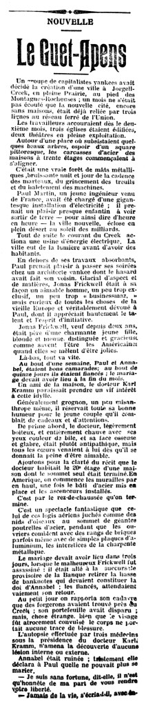 Nous vous signalons aujourd’hui l’existence d’une quatrième publication : « Le Guet-Apens » a en effet été repris, sous la signature de G. Le Rouge, dans La Presse du Centre, quotidien politique, littéraire, agricole et commercial, deuxième année, n° 191, lundi 10 janvier 1910.