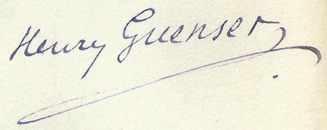 (Henry Guenser, in Journal de Montélimar et de la Drôme, soixante-quatrième année, n° 37 et 38, samedis 10 et 17 septembre 1921 ; « La Panacée universelle, » illustration de Carlo Farneti pour la collection artistique des laboratoires Somnothyril, c. 1931-32. Signature autographe et photographie d’Henry Guenser, trouvées dans un exemplaire de sa traduction du Premier Faust de Gœthe, Paris : Eugène Figuière, 1930)