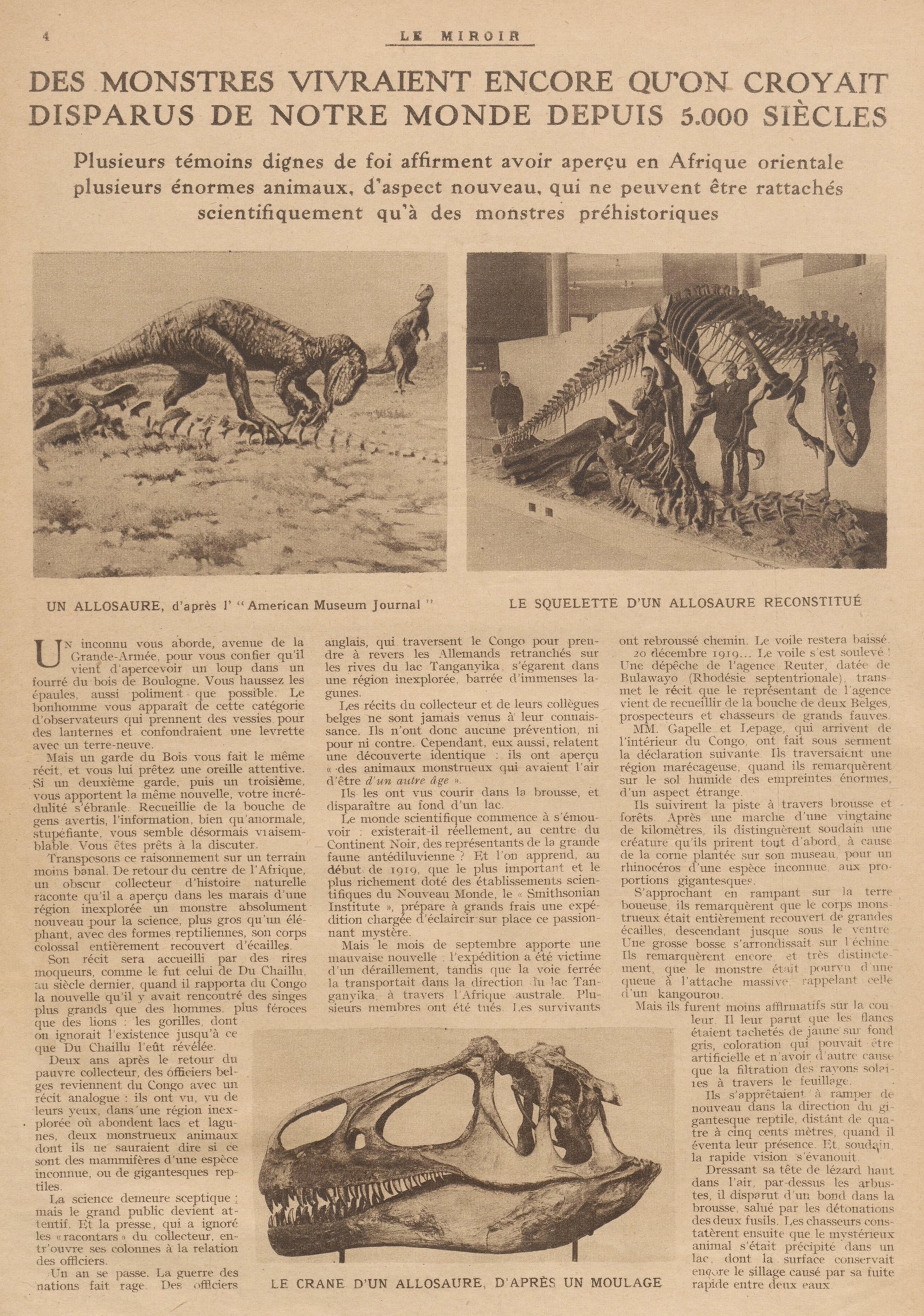 Deux ans après le retour du pauvre collecteur, des officiers belges reviennent du Congo avec un récit analogue : ils ont vu, vu de leurs yeux, dans une région inexplorée où abondent lacs et lagunes, deux monstrueux animaux dont ils ne sauraient dire si ce sont des mammifères d’une espèce inconnue, ou de gigantesques reptiles.