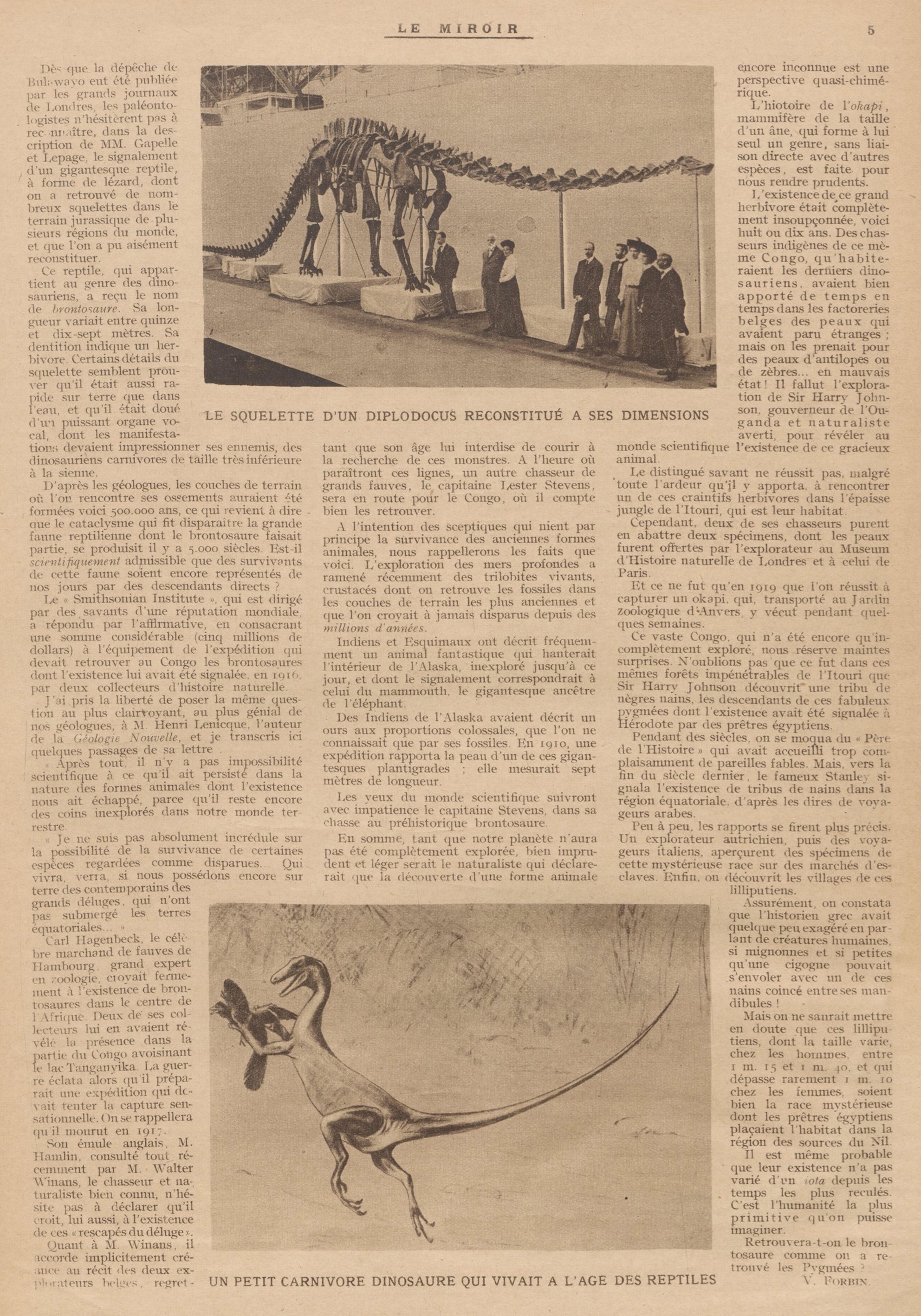 Le « Smithsonian Institute, » qui est dirigé par des savants d’une réputation mondiale, a répondu par l’affirmative, en consacrant une somme considérable (cinq millions de dollars) à l’équipement de l’expédition qui devait retrouver au Congo les brontosaures dont l’existence lui avait été signalée, en 1916, par deux collecteurs d’histoire naturelle.