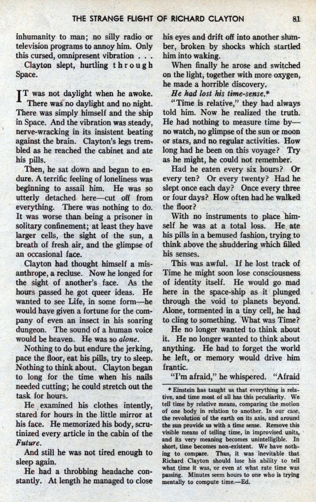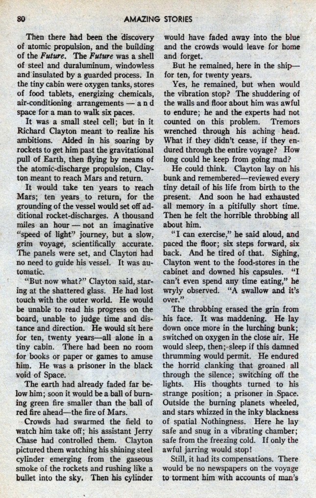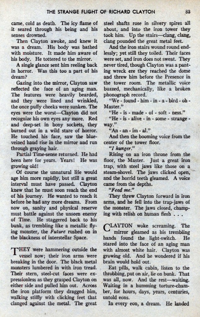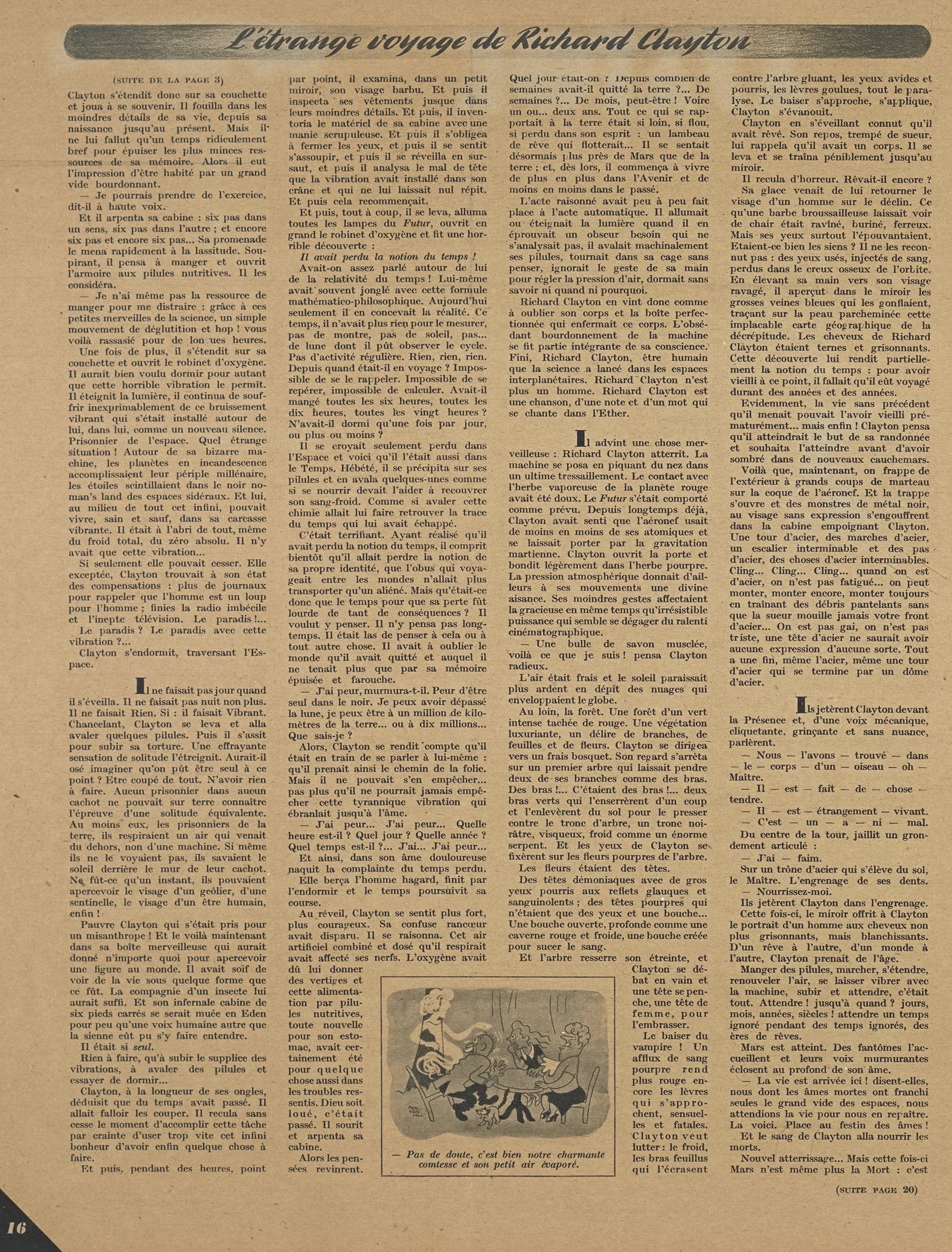 Peu à peu, ayant asservi la nature à tous leurs besoins, à tous leurs caprices, les hommes avaient perdu un à un tous les organes physiques devenus inutiles. La fonction, en effet, créant et perpétuant l’organe, les pieds, ne marchant plus, étaient devenus très petits, leurs orteils s’étaient soudés ; les jambes, n’ayant plus à supporter le poids du corps, un moteur de poche permettant à chacun de bondir à travers l’espace à l’allure de 300 kilomètres à l’heure, s’étaient atrophiées. Déjà l’on consignait de nombreux cas d’ankylose des articulations, si bien qu’on pouvait calculer qu’avant peu, par voie régressive, l’homme serait devenu une espèce de boule constituée par le cerveau, surmontant un tube très grêle, destiné à renfermer les organes indispensables à la vie : quelque chose comme un bilboquet pensant.