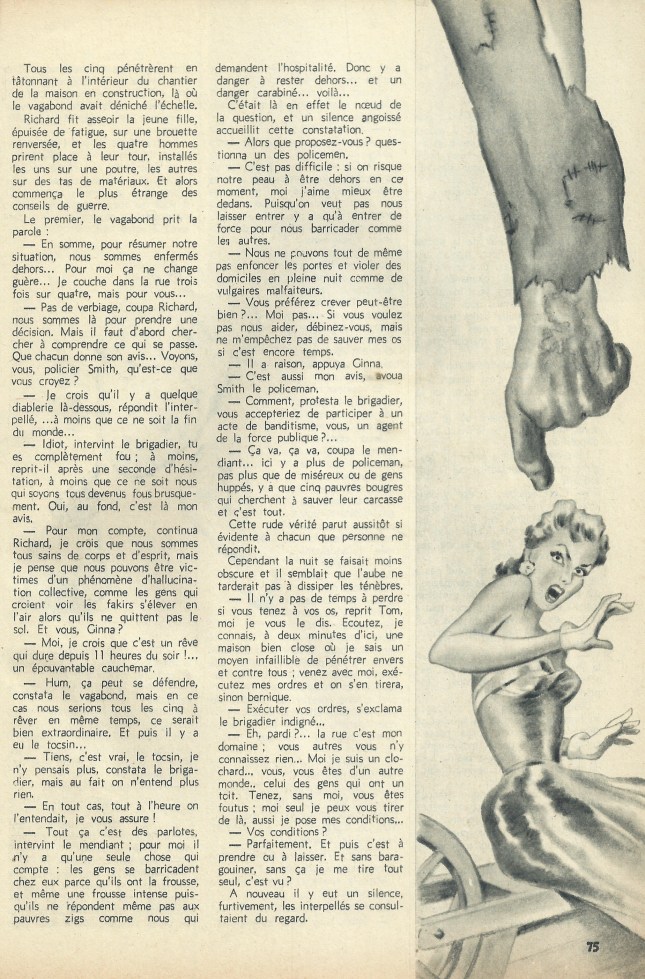 – Tout ça, c’est des parlotes, intervint le mendiant ; pour moi, il n’y a qu’une seule chose qui compte : les gens se barricadent chez eux parce qu’ils ont la frousse, et même une frousse intense puisqu’ils ne répondent même pas aux pauvres zigs comme nous qui demandent l’hospitalité. Donc, y a danger à rester dehors… et un danger carabiné… voilà… »