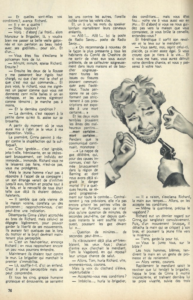 « … La nappe de gaz délétère, qui, pour des causes inconnues, s’est formée brusquement dans la région de Barning et dont nous avons déjà signalé le danger mortel il y a quelques heures, se répand progressivement sur toute la contrée… Contrairement à nos prévisions, elle n’a pas encore atteint les petites villes de Harrow et Putland, mais ce n’est plus qu’une question de minutes, de secondes peut-être, car depuis quelques instants le vent souffle nord-ouest, poussant les gaz devant lui… »