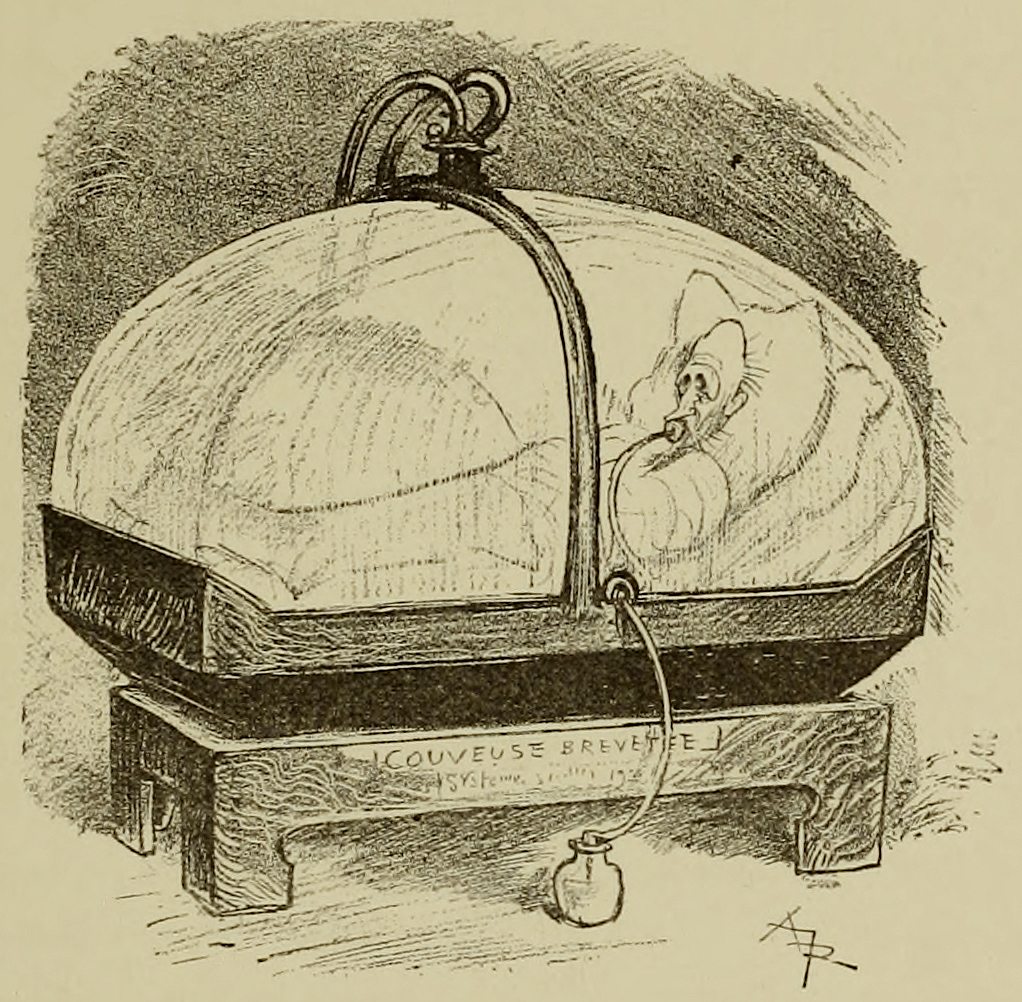 (Jean Aicard, in Le Petit Bleu de Paris, deuxième année, n° 188, mardi 7 février 1899 ; « Le Surmené dans la couveuse, » gravure d’Albert Robida in Le Vingtième siècle : La Vie électrique, Paris : À la Librairie illustrée, 1892)