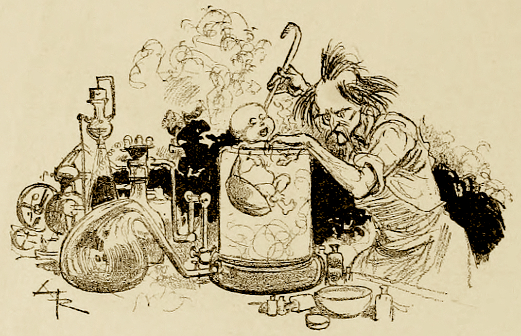 (Ernest Depré, in Le Supplément, grand journal littéraire illustré, quatorzième année, n° 1262, jeudi 16 septembre 1897 ; « Naissance de Sulfatin, » gravure d’Albert Robida in Le Vingtième siècle : La Vie électrique, Paris : À la Librairie illustrée, 1892)