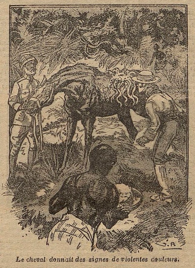 Jack, à ces mots, reprit le couteau qui lui avait servi à me délivrer. Il s’approcha du cheval et, d’un coup vigoureux, il planta la lame d’acier en pleine « écorce, » comme il disait. Cela fit un bruit mat. La chose inconnue qui s’était attachée au cheval, et qui l’avait tant fait souffrir, tomba à terre. Nous éprouvâmes un insurmontable dégoût en constatant que nous avions affaire à un être vivant d’une espèce inconnue, une sorte de pieuvre terrestre qui n’avait ni tête, ni queue, ni tentacules, ni yeux. Elle se présentait sous la forme d’une masse de quatre-vingts centimètres de long, de trente de large, de dix d’épaisseur. Le dos, s’il est permis de donner ce nom à la partie supérieure de cet animal hideux, était rugueux et brunâtre, ce qui expliquait notre erreur première. Quant au ventre, c’est-à-dire la partie opposée au dos, il était pourvu d’une trentaine de suçoirs encore gorgés de sang. En examinant de plus près ce monstre redoutable, nous vîmes qu’il avait deux longs cheveux (je ne puis désigner autrement les antennes très fines qui traînaient à terre). Et nous devinâmes que c’était au moyen de ces organes que la pieuvre terrestre sentait et palpait sa proie avant de se laisser tomber dessus.