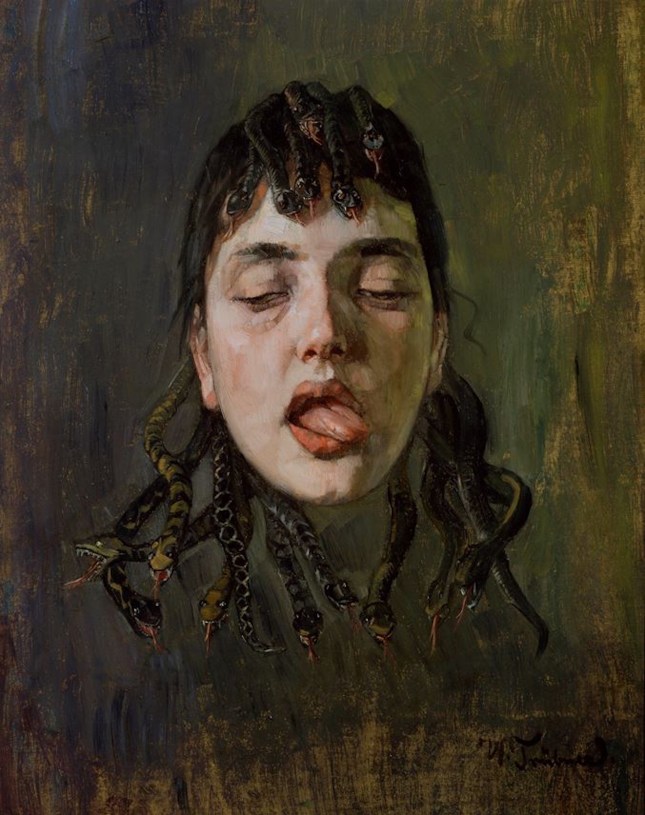 (Ernest-Maurice Laumann, « Nos Contes, » in L’Avenir de Paris, journal quotidien, deuxième année, n° 443, mercredi 7 mai 1919 ; Wilhelm Trübner, « Gorgonenhaupt » [Tête de Gorgone], huile sur carton, 1891)