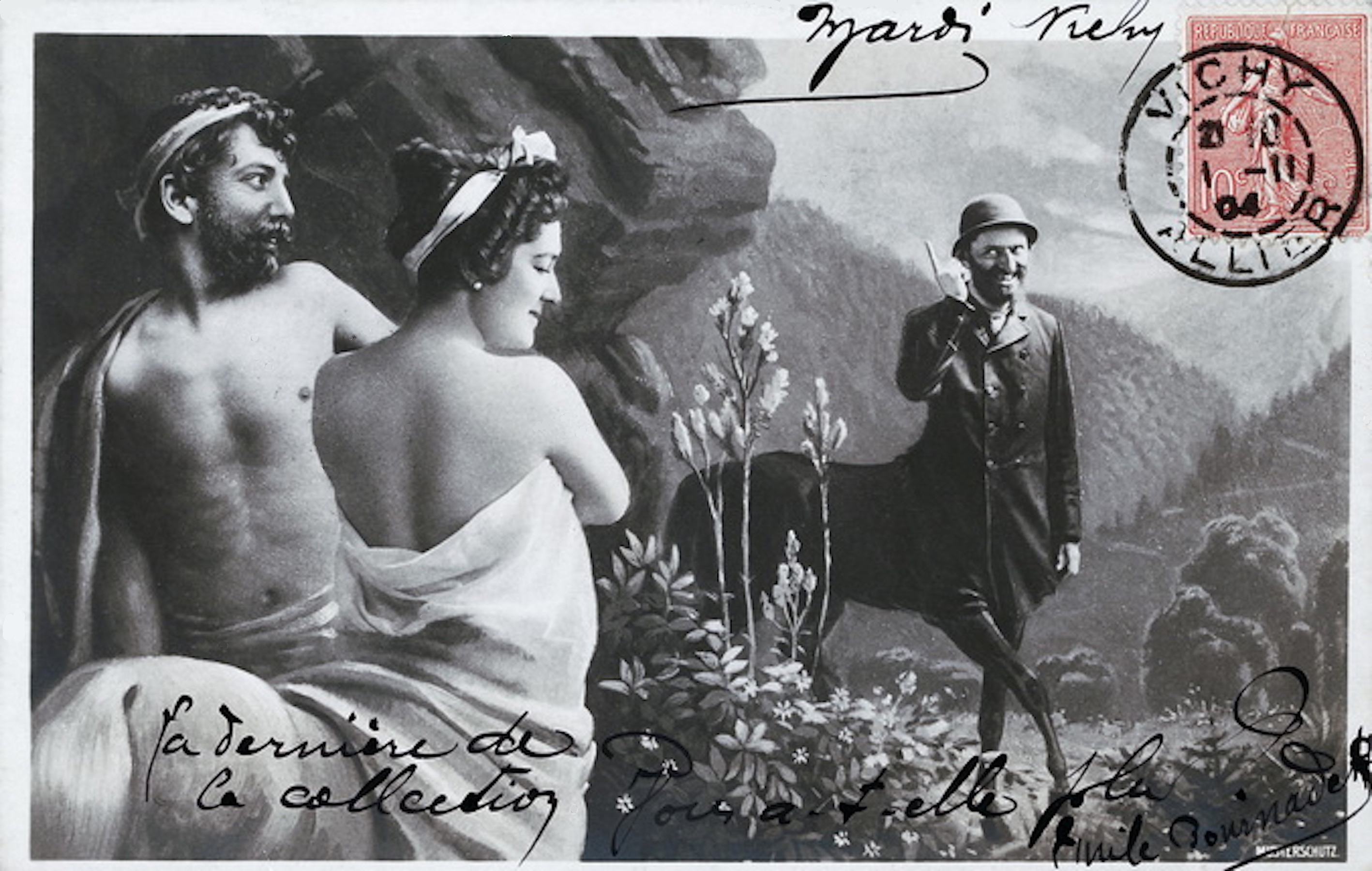 Des personnages velus se glissent derrière les branches et les poursuivent de leurs gaudrioles. Quelques-uns de ces mauvais sujets poussent l’audace, lorsque la femme est jolie, jusqu’à vouloir l’embrasser.