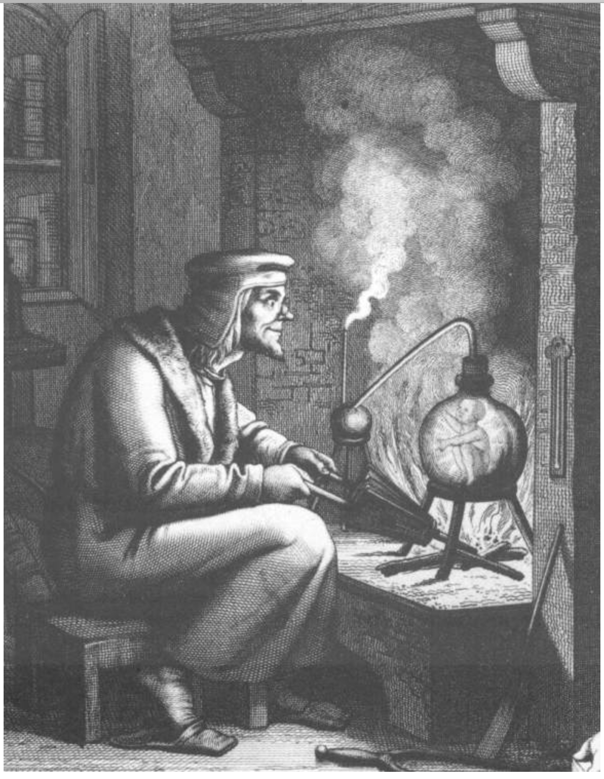 (Frédéric Cousot, in Le Quotidien illustré, deuxième année, n° 48, 28 janvier 1895 ; gravure du XIXe siècle représentant la création de l’homunculus, tirée du Second Faust de Gœthe)