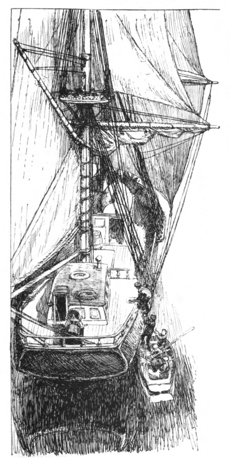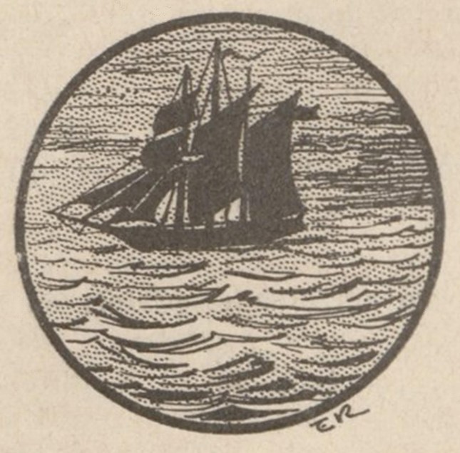 Solidement campé sur ses jambes écartées, une main empochée, l’autre agrippée au tuyau de sa pipe, le brave loup de mer regarde en rêvant la surface bleue aux dessous verts et violets sur quoi la goélette se balance doucement.
