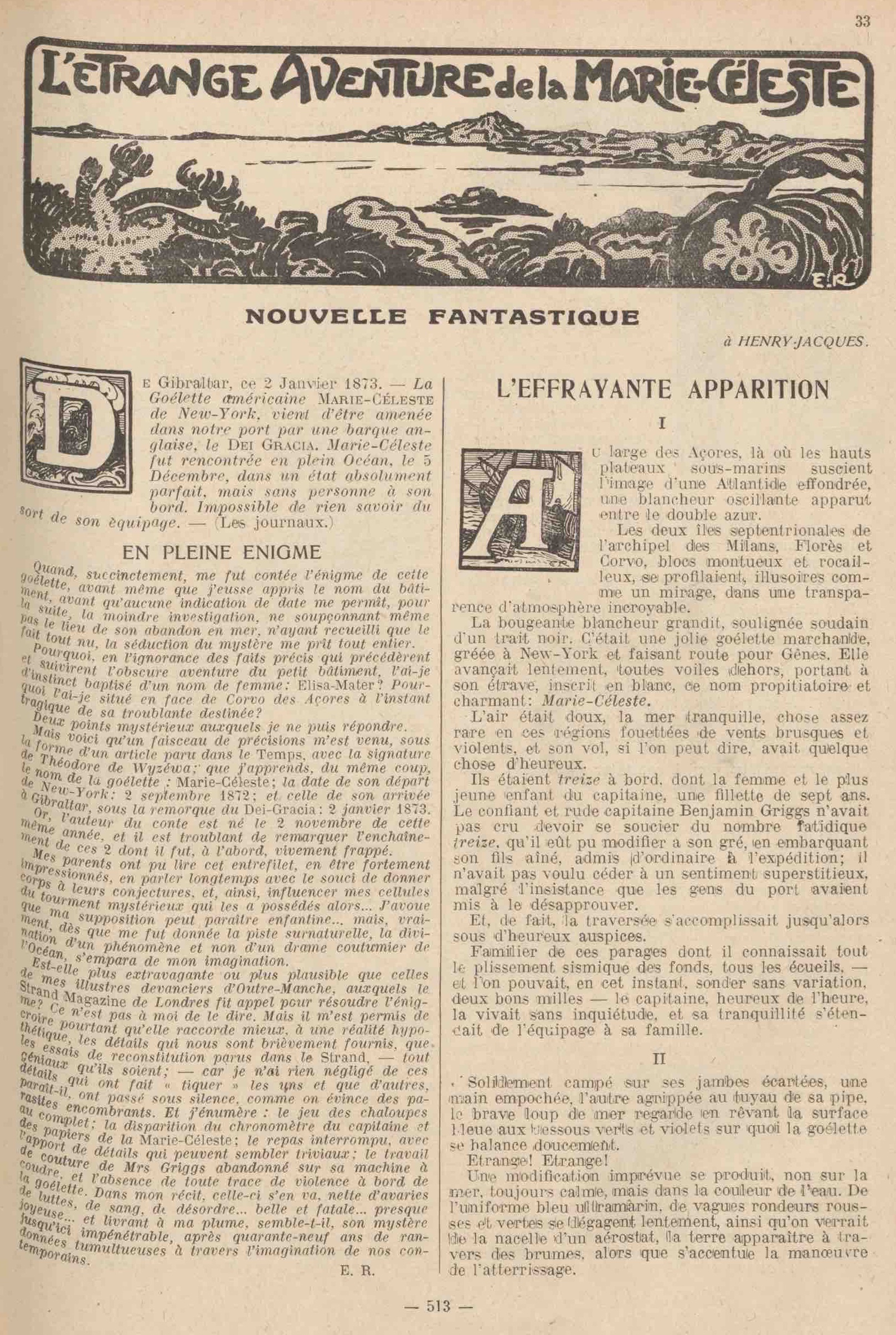 Non, rien de tout cela ne projette la moindre lueur sur la ténébreuse aventure de la Marie-Céleste. Mais j’ai songé, en lisant cet article du Strand Magazine, à la foule des personnes de chez nous qui pendant leurs vacances vont se mettre en quête d’un sujet de roman, de nouvelle, ou de pièce, pour exercer leur talent plus ou moins « professionnel. ». Et je me suis dit que peut-être j’aurais chance de rendre service à quelques-unes d’entre elles en leur indiquant cette histoire qui unit au mérite de l’authenticité la plus entière le précieux avantage de stimuler irrésistiblement la fantaisie créatrice. Qui sait si, sous l’influence supplémentaire du temps brumeux et froid qui paraît installé à demeure pour tout l’été, le modeste résumé que l’on vient de lire ne nous vaudra pas, l’automne prochain, une solution décisive de l’émouvant problème de la Marie-Céleste ?