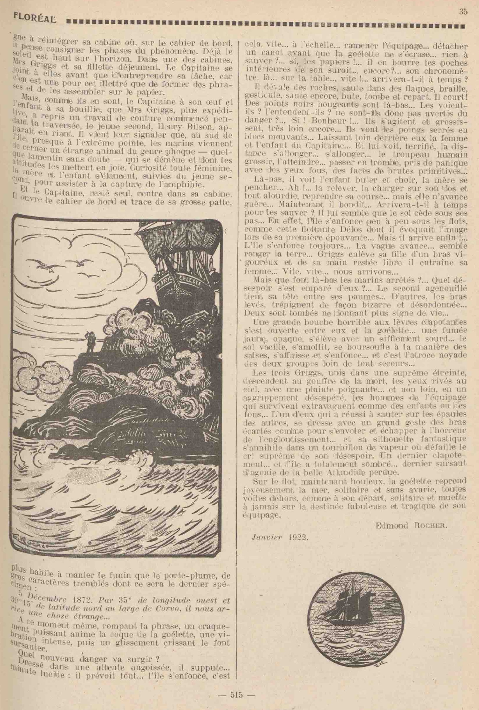 Mes parents ont pu lire cet entrefilet, en être fortement impressionnés, en parler longtemps avec le souci de donner corps à leurs conjectures, et, ainsi, influencer mes cellules du tourment mystérieux qui les a possédés alors. J’avoue que ma supposition peut paraître enfantine, mais, vraiment, dès que me fut donnée la piste surnaturelle, la divination d’un phénomène et non d’un drame coutumier de l’Océan s’empara de mon imagination.