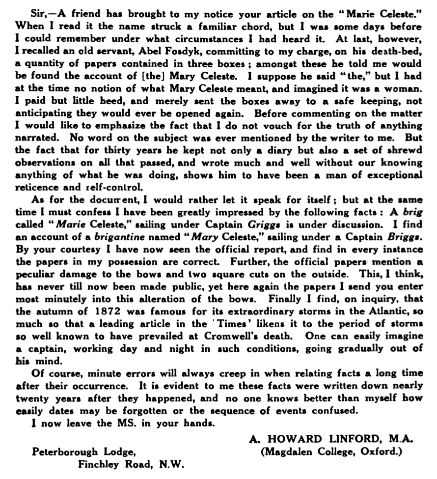 Car il se trouve que l’effort suprême dont je parlais tout à l’heure a porté ses fruits. La revue anglaise a reçu communication d’un long manuscrit qui ne prétendait pas à moins qu’à être la « confession » authentique de l’un des membres de l’équipage de la Marie-Céleste ! L’envoi s’accompagnait d’une lettre où le possesseur du manuscrit, M. Howard Linford, racontait que l’un de ses anciens serviteurs, appelé Abel Fosdyk, lui avait laissé en mourant trois caisses toutes remplies de papiers. « Vous aurez là-dedans – lui avait dit le moribond – l’explication de l’affaire de la Marie-Céleste ! » Mais M. Linford avait oublié l’aventure mystérieuse de la goélette ; si bien que prenant la Marie-Céleste pour un nom de femme, il n’avait pas même regardé les papiers posthumes du vieux domestique. C’est seulement l’autre jour, en lisant l’article du Strand Magazine, qu’il s’était rappelé les dernières paroles d’Abel Fosdyk. Il avait alors ouvert les trois caisses, et y avait rencontré, notamment, un récit détaillé de tout le funeste voyage de la Marie-Céleste, écrit aux environs de 1880 par l’unique survivant de la catastrophe.